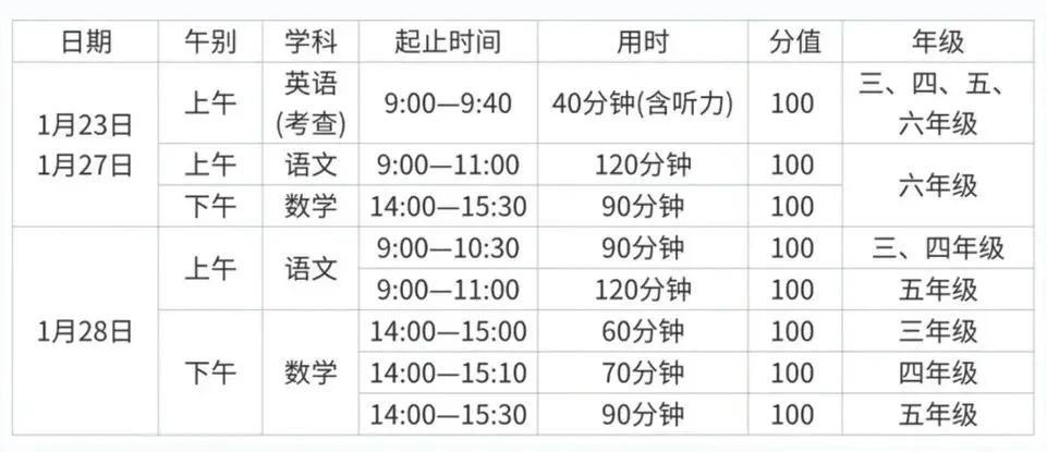 但也有部分区域考试启动较早,例如巴南区和九龙坡区的三、四年级将于1月22日率先开考。一起来看看具体安排时间吧。