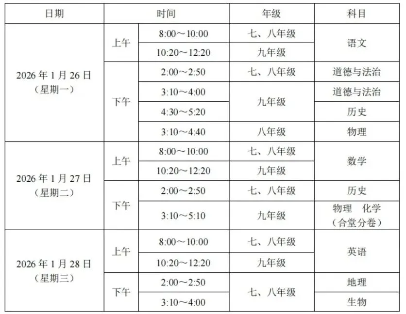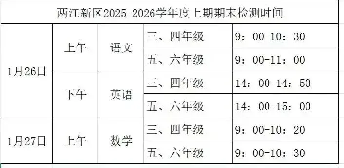 重庆市中小学现已全面进入期末冲刺阶段,各区陆续发布期末考试时间安排,多数区域集中在1月26日至1月28日之间。