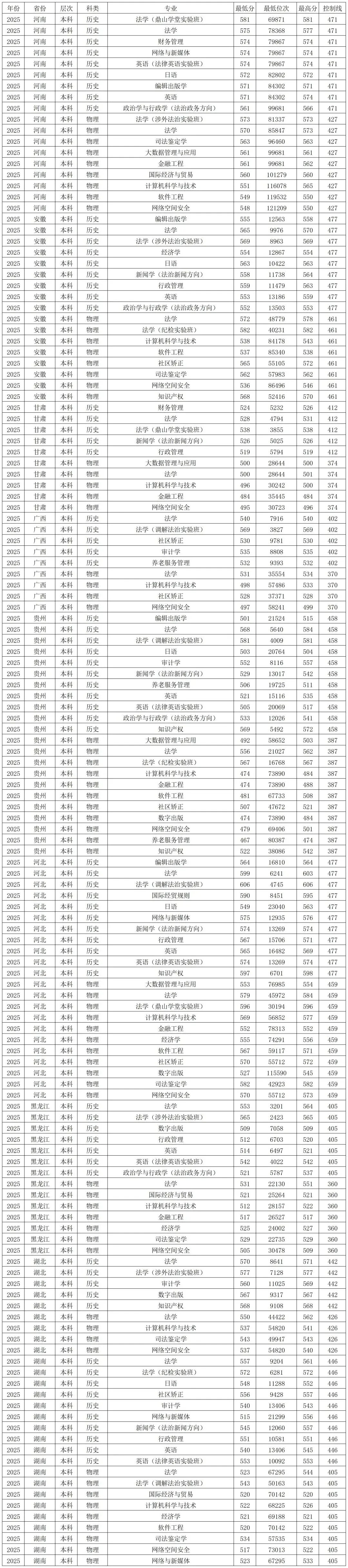 物理类录取分数线较高的专业:法学(涉外法治实验班)573分、法学570分、司法鉴定学563分,最低的是网络空间安全548分,最低分位次121209。