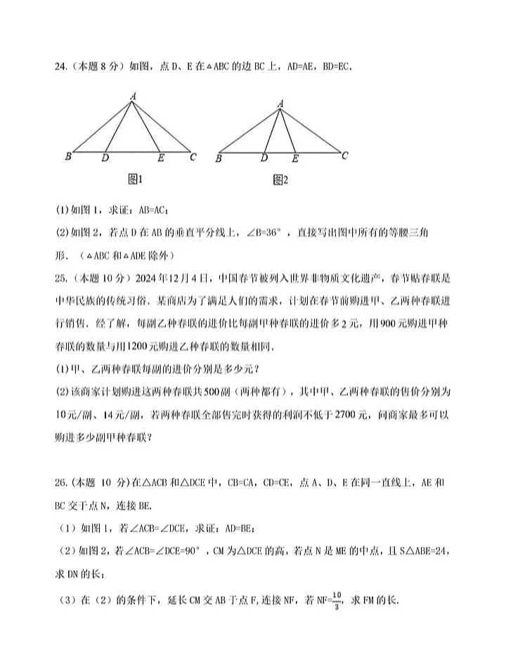 >2026初中数学期末考试卷1