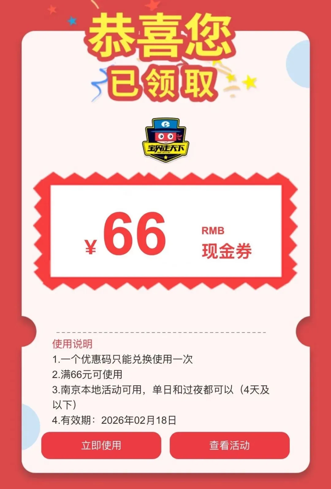按要求转发此公众号推文,集赞8个,可获得一张66元优惠券(4天及以下活动可直接抵扣)