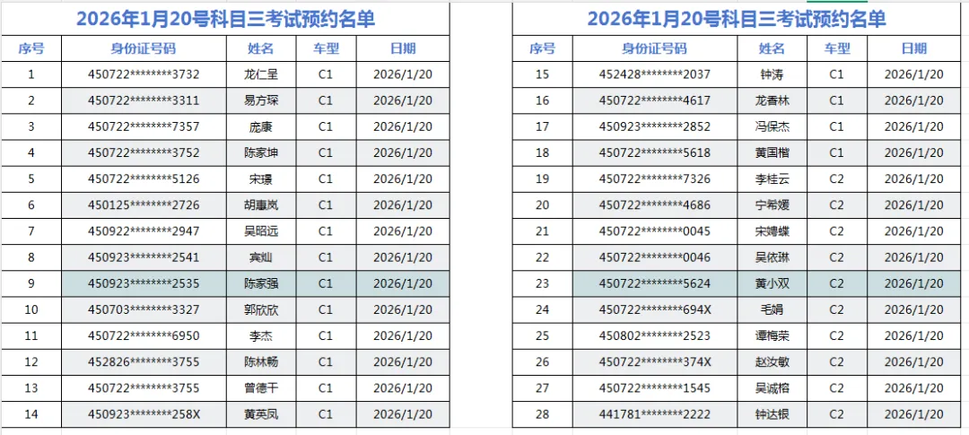 >科目三2026年1月20日考试预约名单