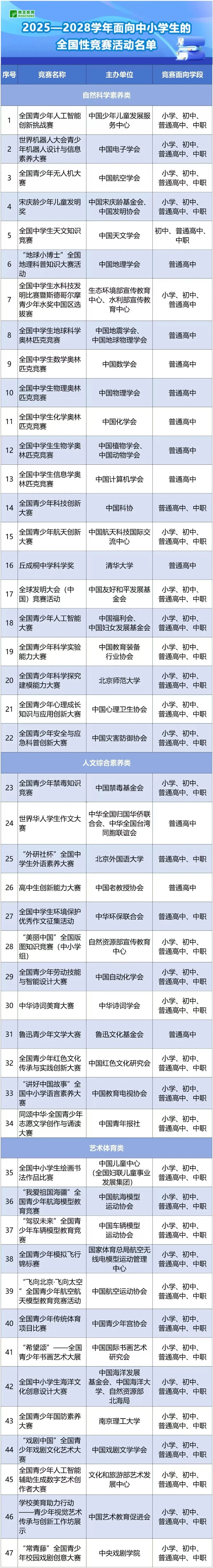 本次公布的名单共 47 项赛事,分为自然科学素养、人文综合素养、艺术体育三大类。其中自然科学素养类占 22 项、接近半数,且以编程、人工智能等科创相关赛事为主,凸显国家对青少年科技素养与创新能力培养的重视,为孩子科创兴趣发展指明方向。