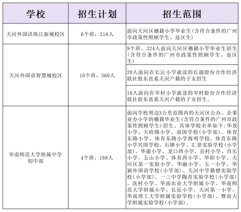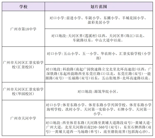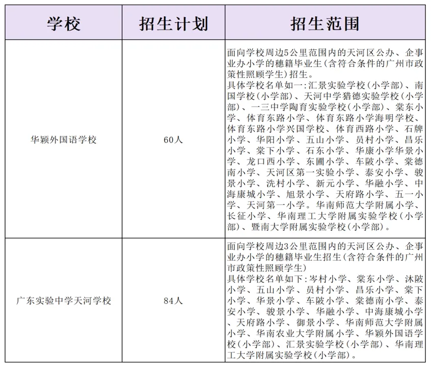 这些学校部分面向全区招生(比如清华附中湾区学校、天河外国语),部分面向周边地段(比如华附、省实天河仅面向学校周边3公里)。