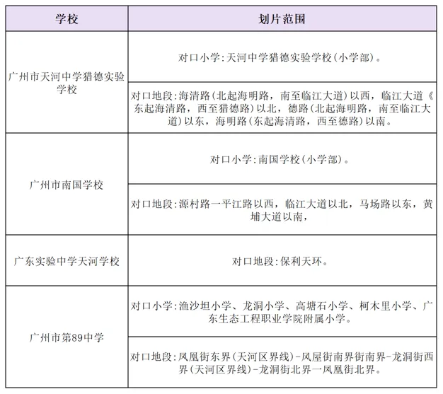 第一类,最简单直接:就是你孩子户口在天河,小学呢,也是在天河的公办小学读的。毕业了就直接对口直升到小学对应的那所初中去。
