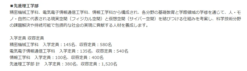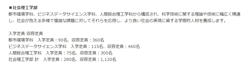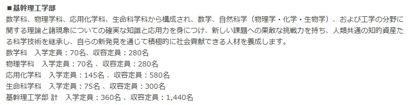 已对外公布的新学部基干理工学部示例合计:360 名(数学70、物理70、応用化学145、生命科学75 等);其它两学部亦有相应分配:社会理工学部280名,先进理工380名,学科方面以强化数理基盘、理工跨领域与社会问题导向的人材培养为主。