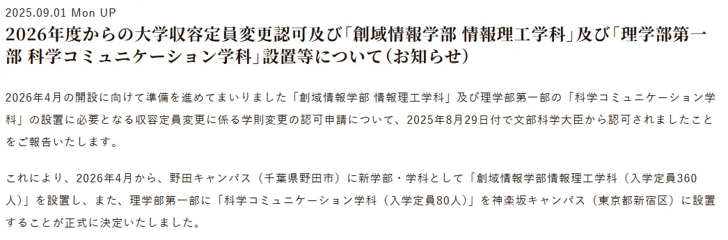 东京理科大学已向文部科学省申请设立新学部,计划于2026年4月在野田校区开设“创域情报学部 情报理工学科”,入学定员为360名。此外,理学部第一部将在神乐坂校区(东京都新宿区)正式设立“科学传播学科”,入学定员80名。