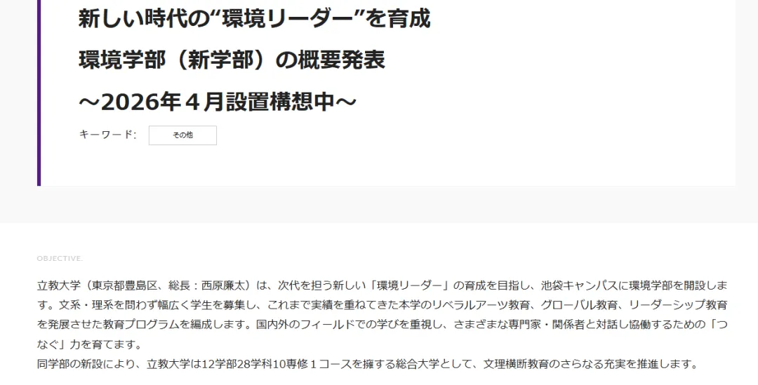 立教大学计划于2026年4月在池袋校区新设环境学部,入学定员为204名。