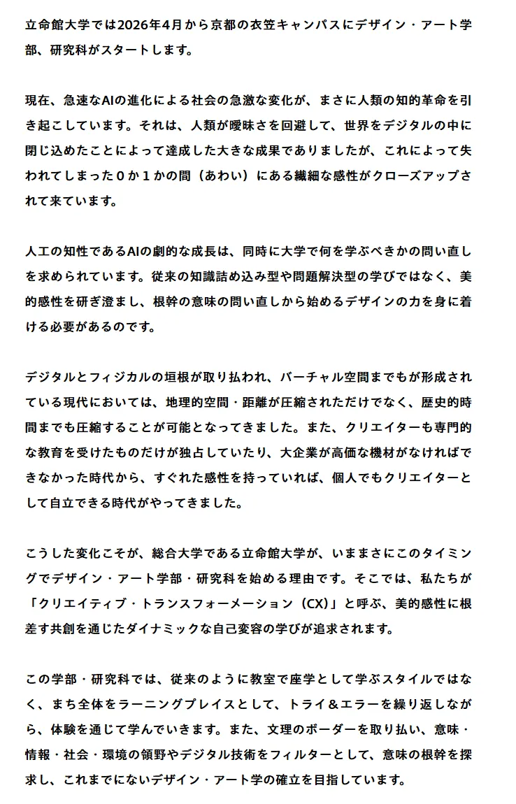 立命馆大学将于 2026 年 4 月在衣笠校区设立设计·艺术学部,入学定员为180 名。