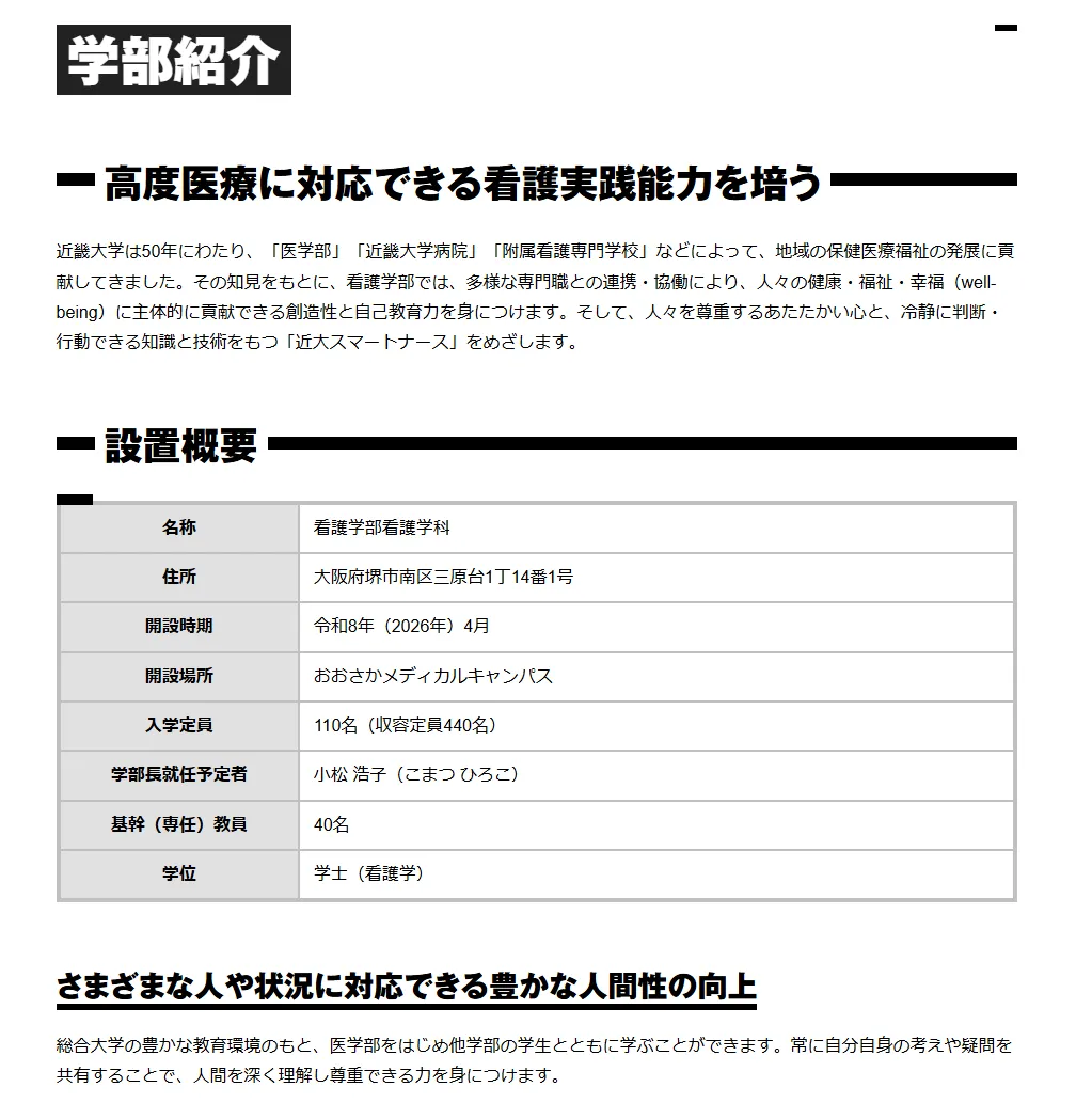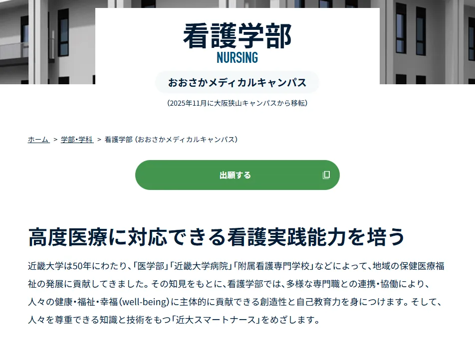 近畿大学将在大阪医疗校区设立护理学部(看護学科),入学定员为110 名。