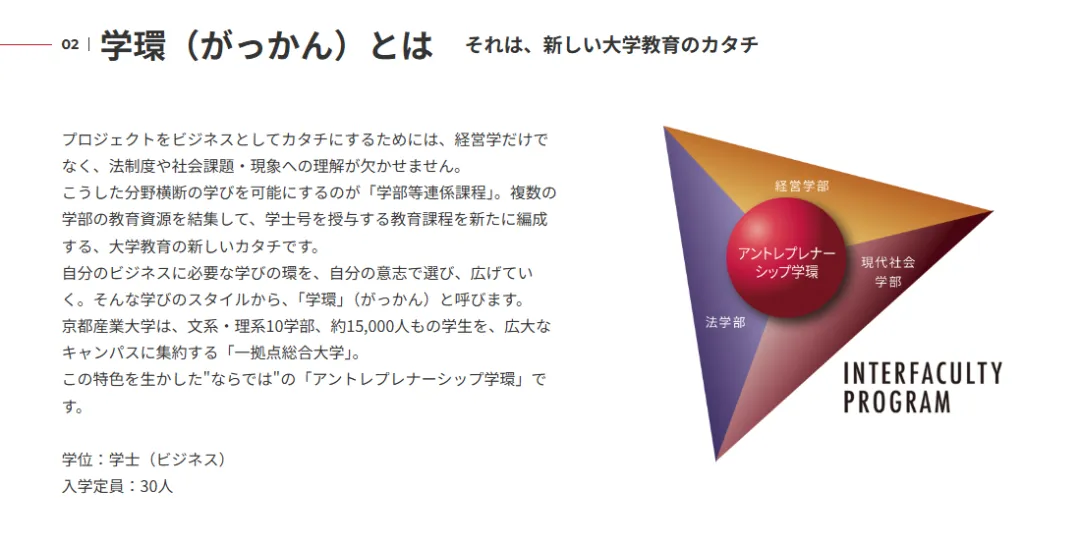 京都产业大学于 2026 年 4 月推出跨学部课程体系“创业精神学环”(小组),入学定员为30名。