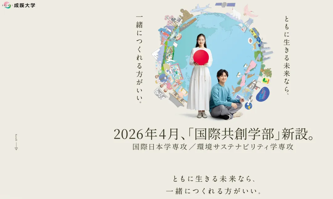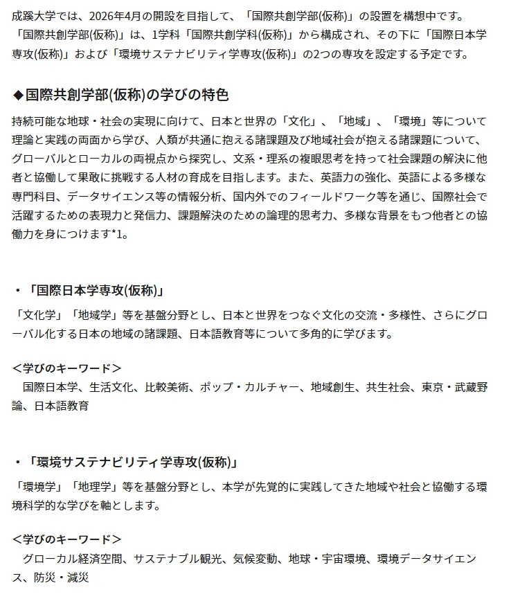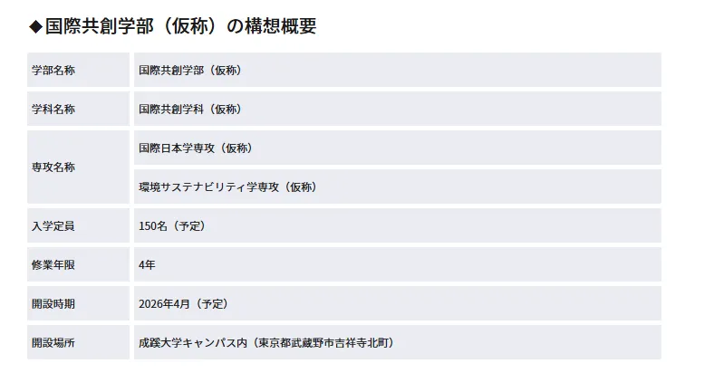 成蹊大学已获得文部科学大臣认可,将于 2026 年 4 月设立国际共创学部,国际共创学科,入学定员150名。
