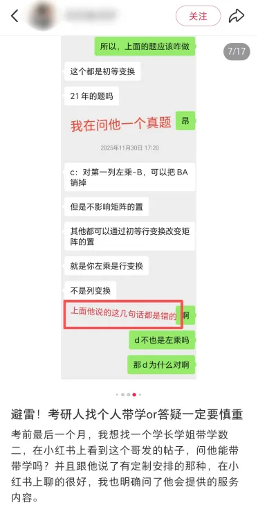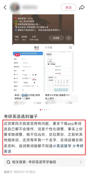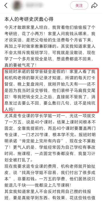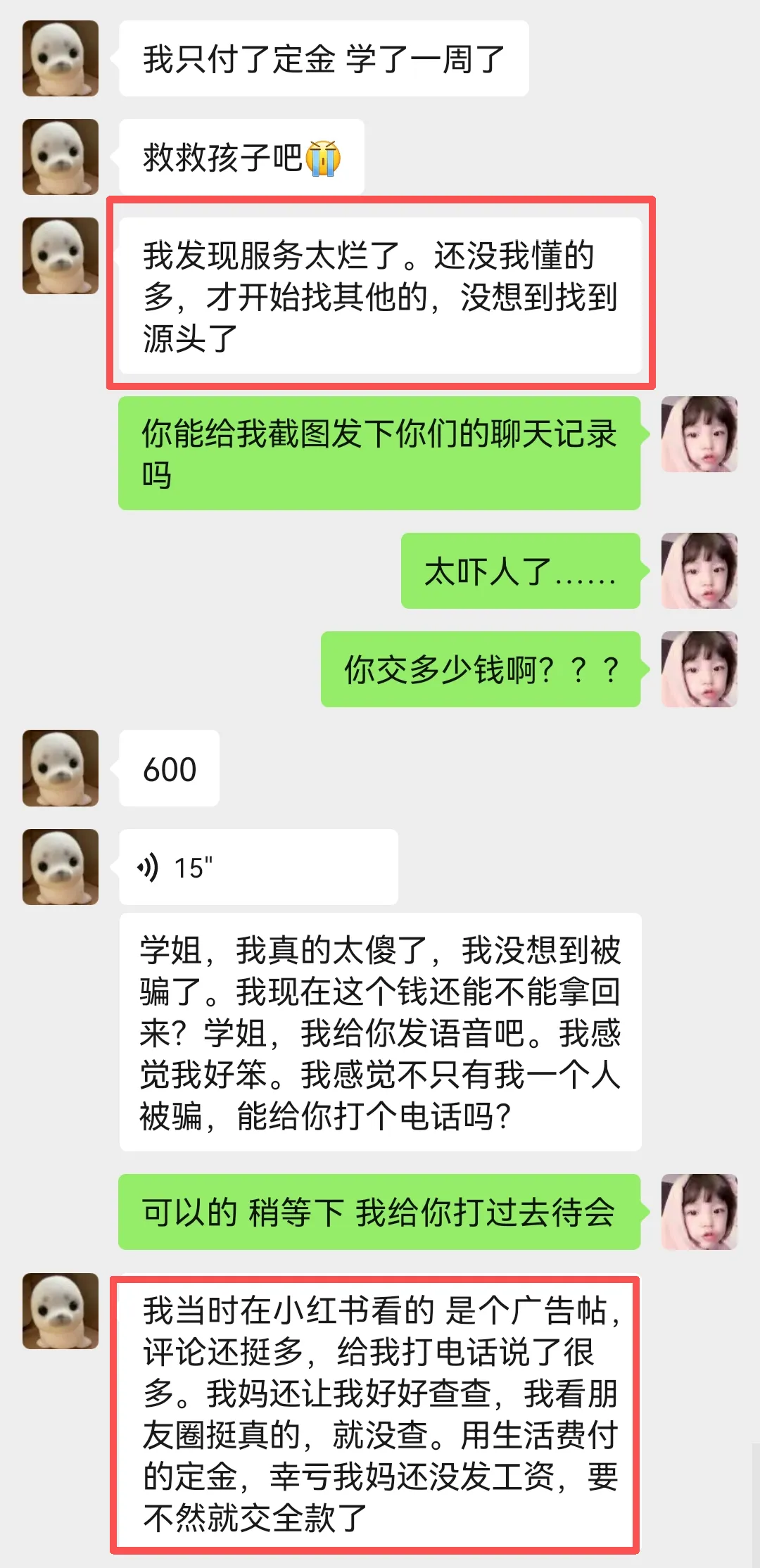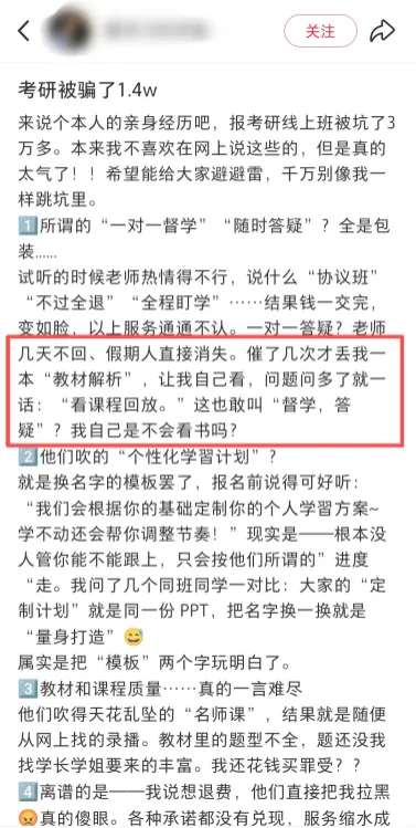 结果一旦学生交了钱之后,就把你拉到一个上课群,里边二三百人,各种广告信息;就开始不回信息;答疑学长学姐专业性不强,一个题专业知识讲错,掰扯好几天;还有就是模板式定制“只修改名字,不修改内容”……服务和之前说的大相径庭。