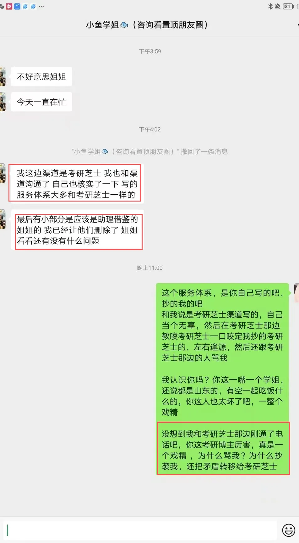 在我找她核实对峙的时候,把责任丢给第三方,并且教唆第三方机构统一口径,一起骗我,一起攻击我,后来我去第三方机构核实,上来就被骂了,后来才发现小鱼学姐把第三方机构蒙在鼓里,“小鱼学姐全程督学里的服务内容和话术”是小鱼学姐本人亲自撰写的,和第三方机构没有关系。