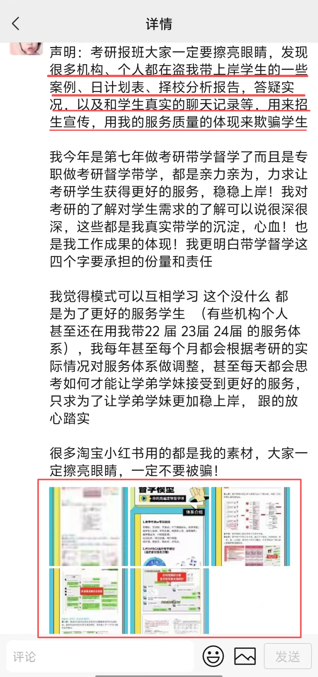 我带学已有八年时间,在我读研期间就开始了带学,而“专科考研学姐—小鱼”在我研究生毕业之后才开始考研,谁抄袭谁一看便知!