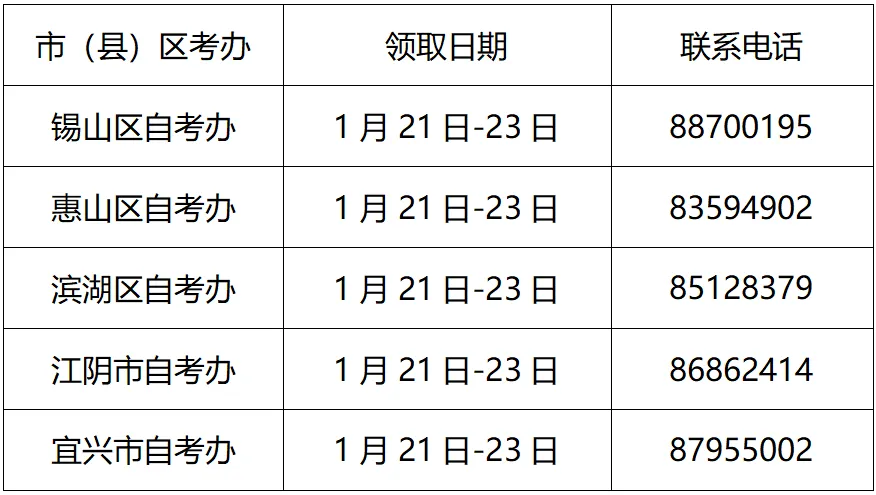 我市2025年下半年申请自学考试毕业的城区考生(准考证号0201开头),请于2026年1月21日-23日携带本人身份证原件至无锡市教育考试院领取毕业证书。领取时注意核对毕业信息、清点毕业材料,材料包括:毕业证书、毕业生登记表、毕业证书封壳。