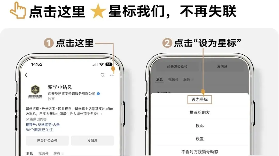 最近微信公众号改版,没有加 “星标★”的订阅号,收到的推送仅有标题和小图,或者十天半个月都无法收到最新的推送。想要不错过前沿的留学信息,大家务必将『留学小钻风』设置为“星标”。方法超简单!只需要按照上图指引完成操作即可。