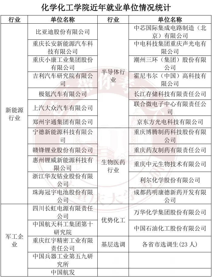 毕业生就业选择囊括世界500强、中外名企、国家机关单位、科研院所等单位,如:中石油、中石化、中国航天科工集团、中核集团、中国电子集团、华为、长安福特、比亚迪、宁德时代、万华化学、强生医疗、迈瑞医疗等。
