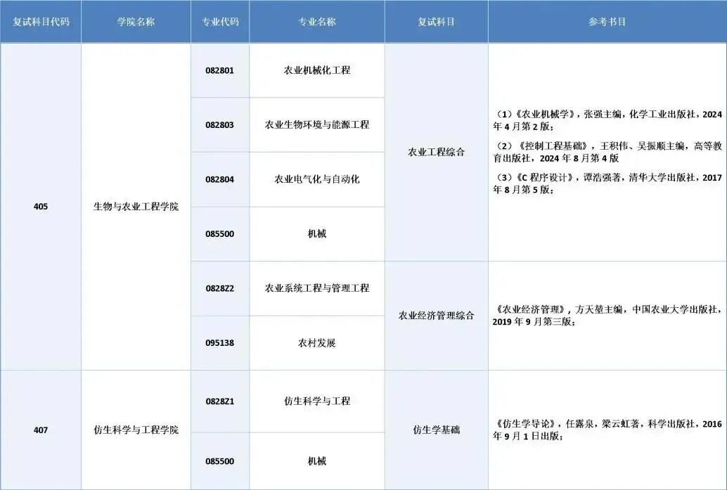 生物与农业工程学院、仿生科学与工程学院公布2026年硕士研究生复试科目参考书目。