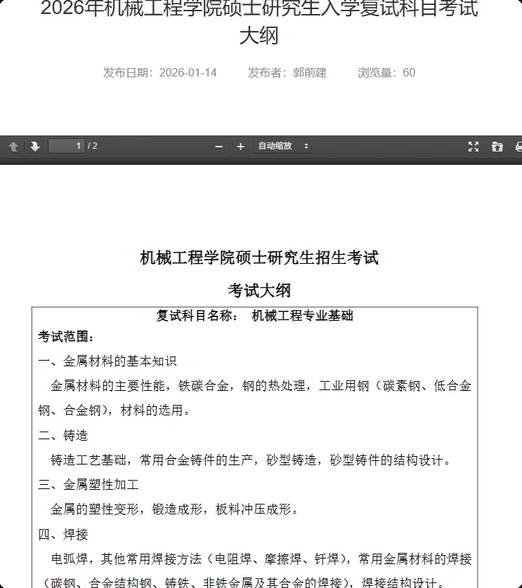 发布了2026年机械工程学院硕士研究生入学复试科目考试大纲。