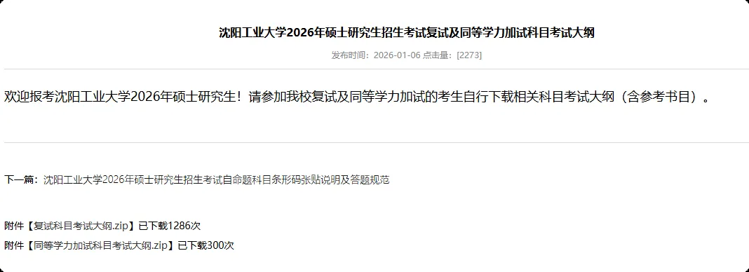 沈阳工业大学公布了2026年硕士研究生招生考试复试及同等学力加试科目考试大纲。