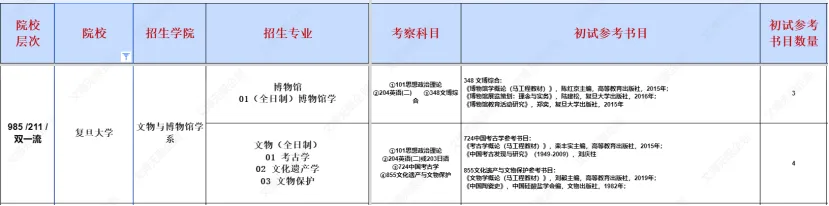 复旦大学文博专硕虽竞争激烈,但参考书目相对集中,常见《博物馆学基础》《文物学概论》等4本左右。复旦注重学术视野与批判思维,考生需在掌握基础的同时关注行业动态与策展实践。