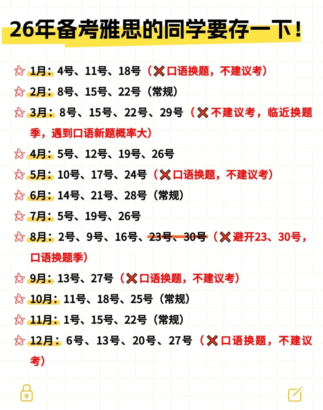 ③、避开特殊时期:一般来说,换题季(1月、5月、9月)首场考试口语题目会更新,对口语没把握的宝子可以避开10月首场考试。