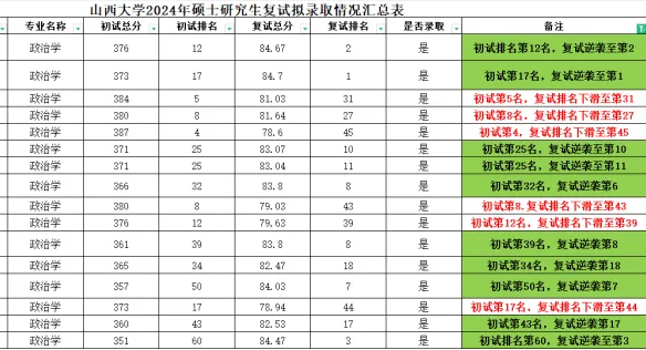 山西大学招生人数很多,往年有很多初试排名靠后复试逆袭上岸的例子,比如下图当中有初试50.60名,复试逆袭到前十的,当然也有初试排名前十,复试下滑很多的,所以未到最后谁都不知道结果是怎样的,只要有进入复试的希望,就要全力以赴抓住每一次机会。