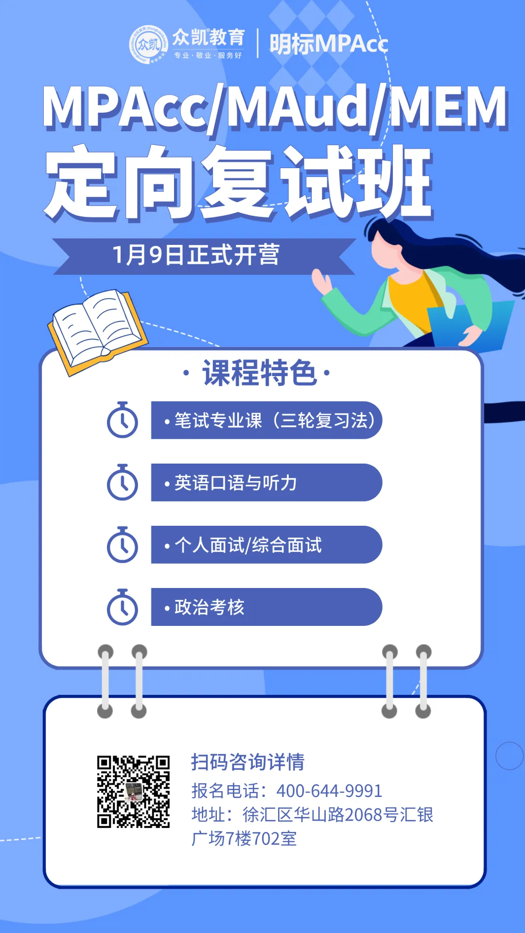 可以来众凯明标MPAcc/MAud/MEM定向复试班,针对性指导复习更高效