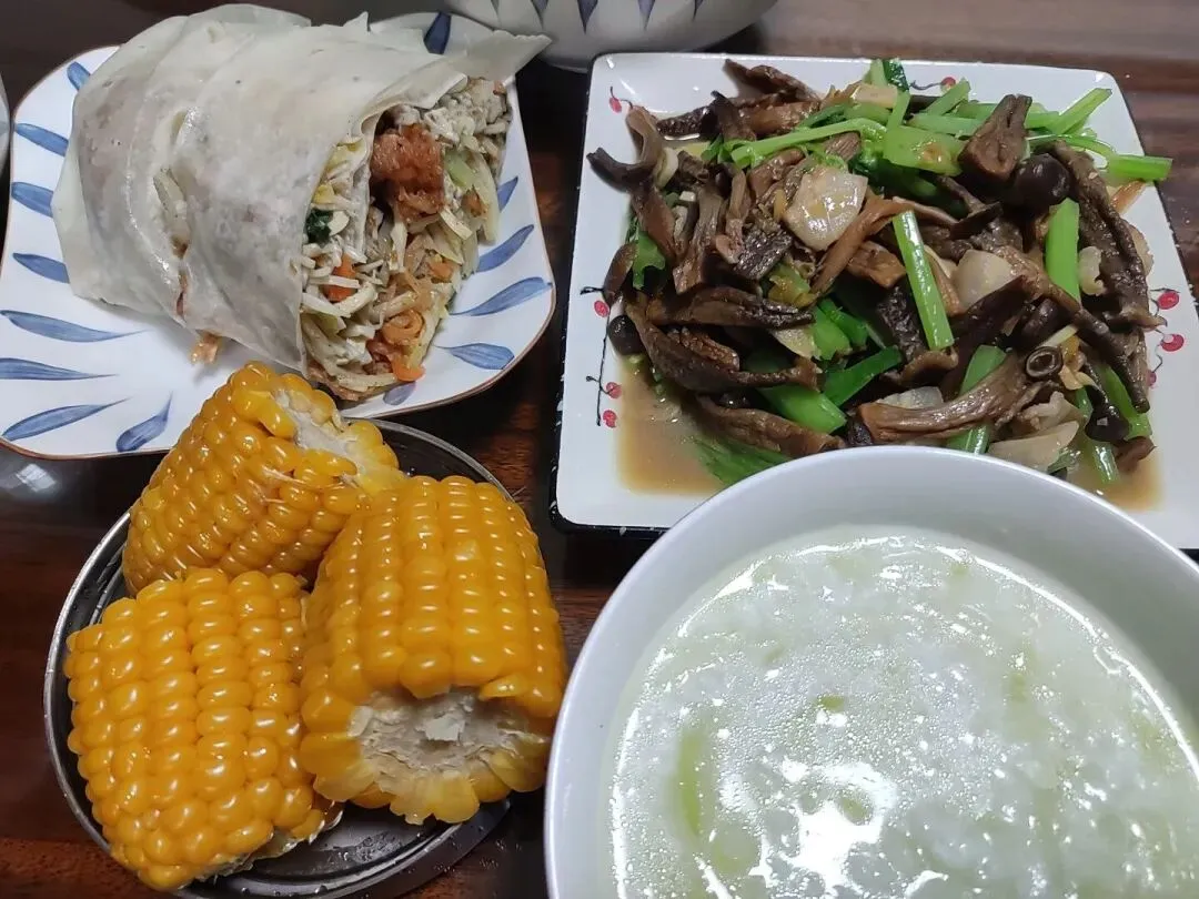 晚饭是亲爱的的做的,大米萝卜粥,鹿茸菇炒芹菜,玉米,还有一个我从学校带的卷饼。