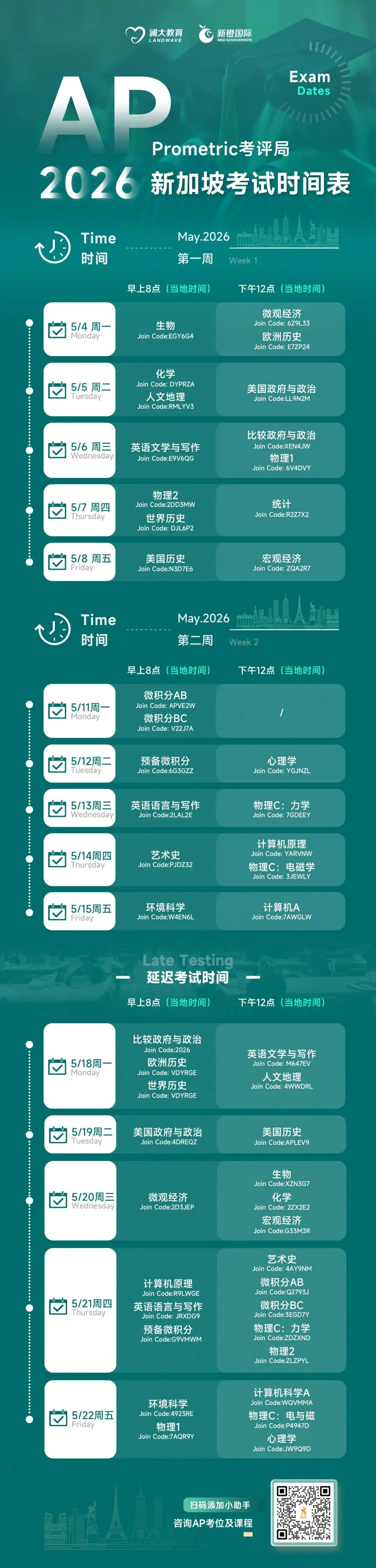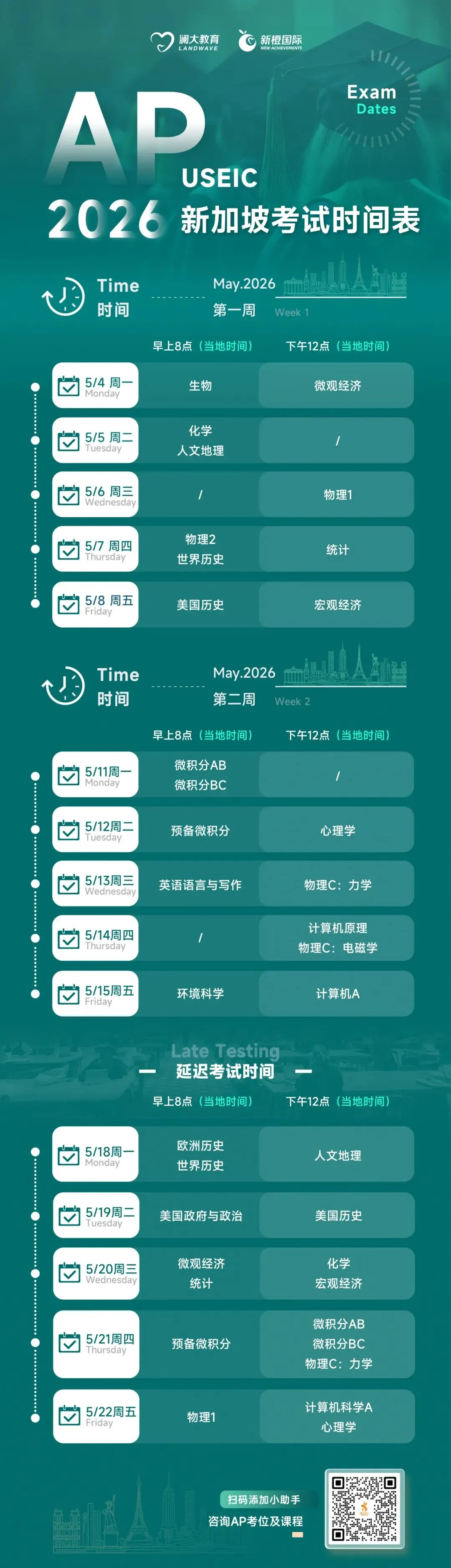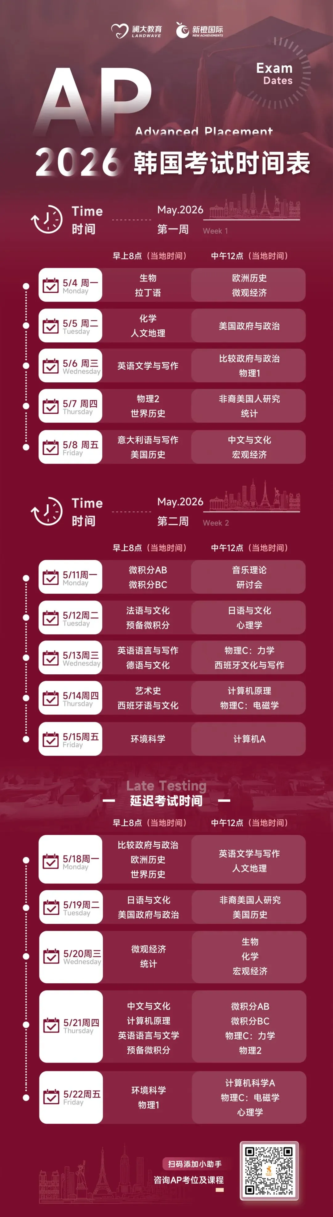 接下来,小澜给同学们汇总了香港/新加坡/韩国 考区2026年AP二轮报名时间&流程、报名费用、考试时间等等,大家记得收藏,方便即时查看。