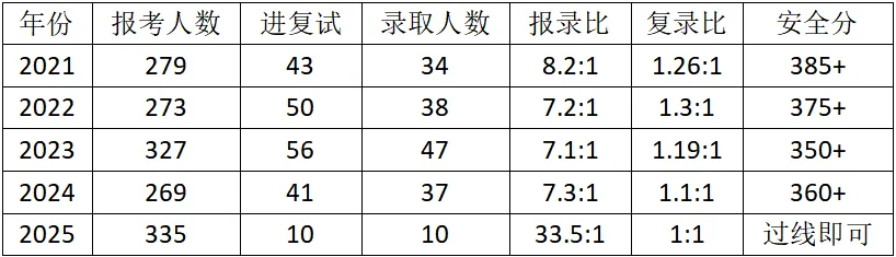 安全分随复试线同步下调,21年安全分385+,超出复试线17分;22年375+,超出复试线19分;23年350+,超出复试线10分;24年360+,超出复试线13分;25年因全部录取,无明确安全分要求(达到国家线即可稳妥录取)。