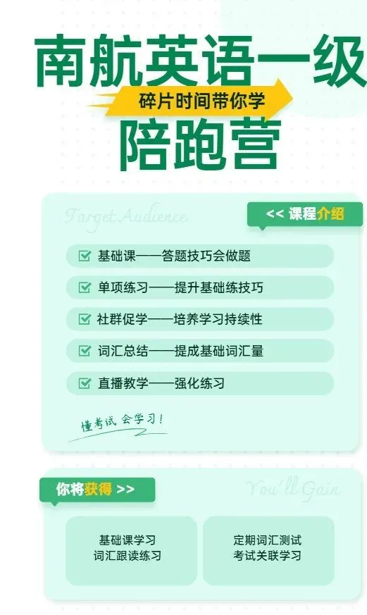 【南航英语考试】陪跑考过为止!一、二级陪跑训练营、福利开启(面试机考更有招)