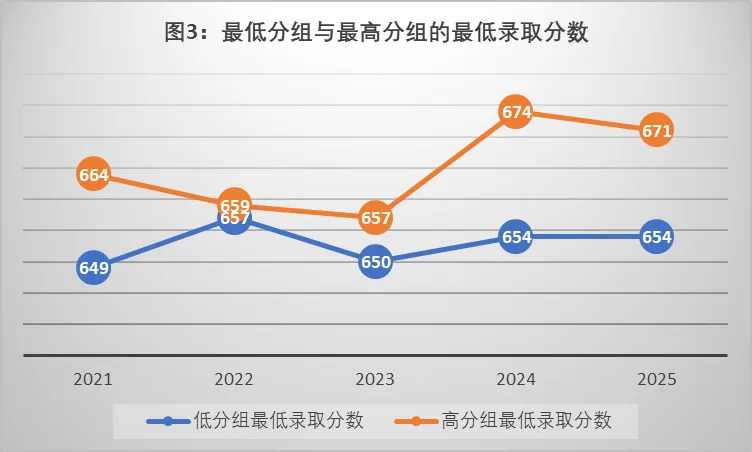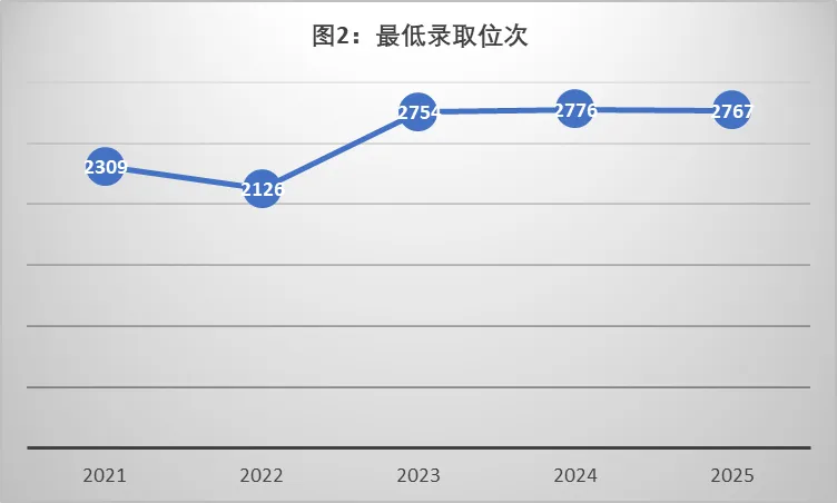 从图1中可以看到,北京理工大学2023年~2025年的最低录取分数相差不大,且2024年和2025年的最低录取分数相同。从图2的最低录取位次来看,这三年的录取位次接近。
