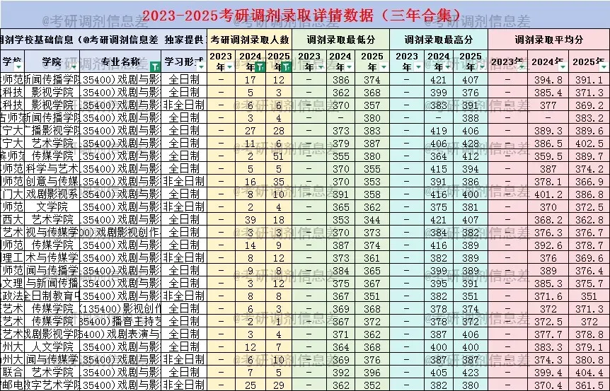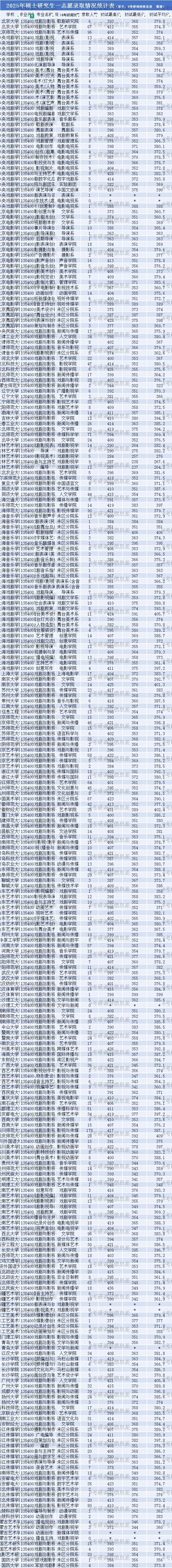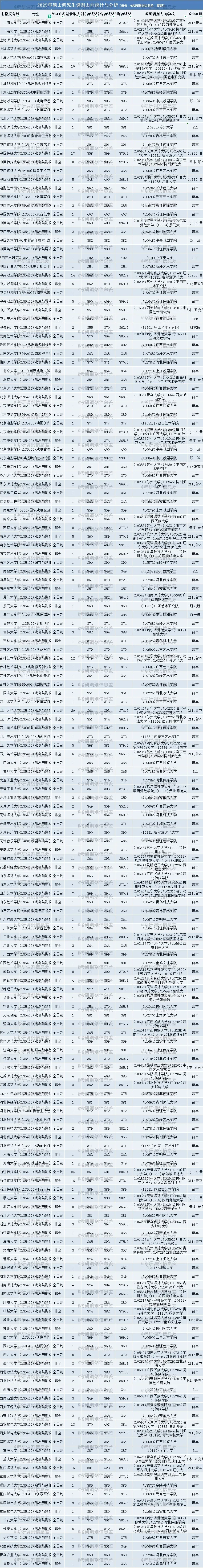 1️⃣ 受2025年考研总人数下降📉50万影响,多数专业一志愿报考人数减少,调剂名额相应增多,艺术学-戏剧与影视专业亦不例外。2025年,该专业一共有125所院校招生,其中44所接受考研调剂,共录取调剂生589人。热门院校如四川师范大学,一志愿录取178人,一志愿录取最低分363分,未接收考研调剂。各院校具体录取情况见下图(部分展示),部分院校出现“一志愿录取人数少于考研调剂录取人数”“一志愿最低分高于调剂最低分”:上海师范大学,录取90人,录取最低分351分;