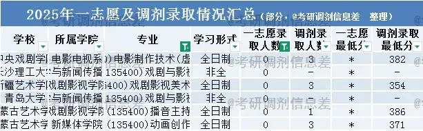5所院校一志愿无人录取,完全通过调剂完成招生,例如中央戏剧学院调剂录取3人。2025年,该专业一共有44个学校接受考研调剂,录取调剂生589人。其中考研调剂录取人数最多的学校是河北传媒学院,考研调剂录取75人,录取最低分66分。调剂生源一志愿院校包括浙江传媒学院9人,四川师范大学9人,西安工程大学4人,西安邮电大学4人,安徽财经大学4人,成都理工大学4人,广州大学3人,西北大学3人,扬州大学2人,重庆邮电大学2人,中国传媒大学2人,成都大学2人,江汉大学2人,河北科技大学2人,山东艺术学院2人,信阳师范学院2人,南昌航空大学2人,长安大学2人,江苏师范大学2人,天津工业大学2人,湖南师范大学1人,重庆师范大学1人,西北政法大学1人,南京艺术学院1人,海南大学1人,暨南大学1人,吉林艺术学院1人,西南石油大学1人,广西大学1人,山东师范大学1人,上海师范大学1人等。调剂选学校,最重要的就是参考去年接收调剂院校,从“录取量”与“录取分”双维度定位📊调剂录取人数TOP3院校: