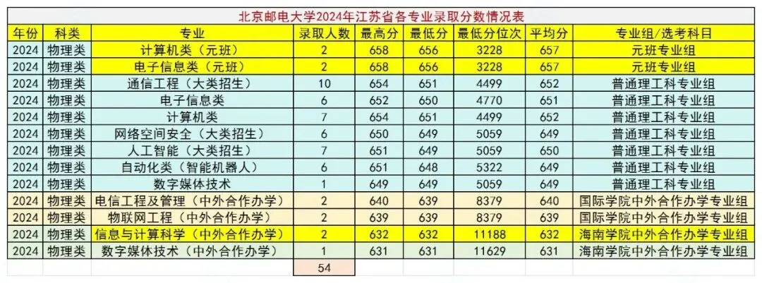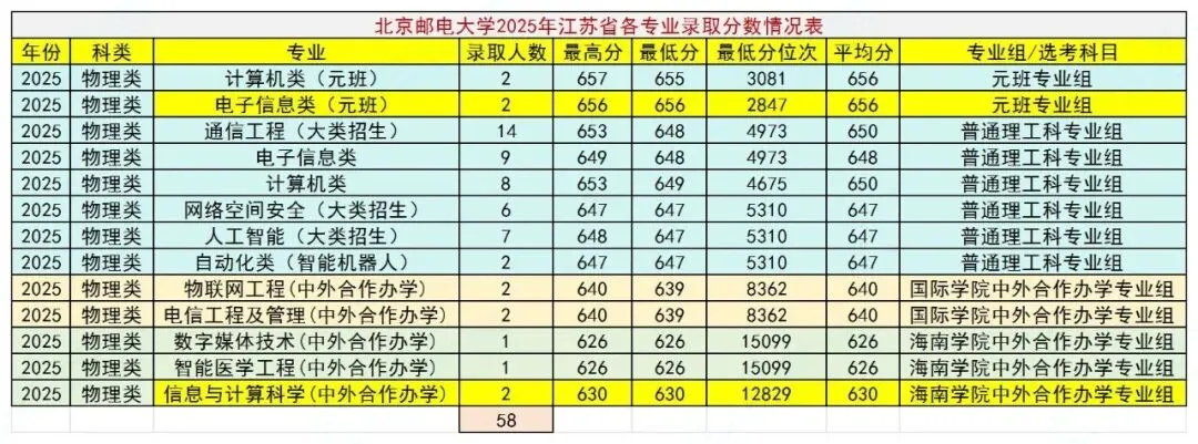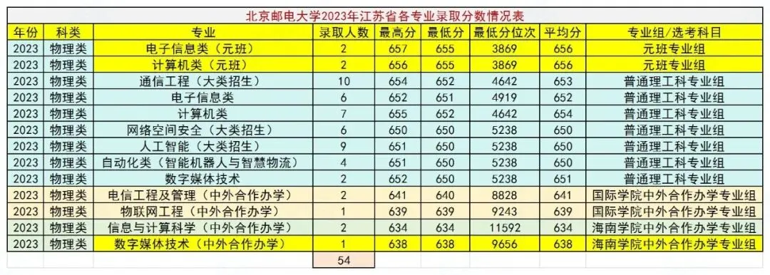 学校2025年各专业的录取分数线已经公布,这里将其江苏省录取分数线及位次情况整理出来,并将去年和前年的录取情况也一并列出,放在一起进行比较,方便大家全面了解学校在江苏省的招生录取情况,我们一起来看看。各类各专业共录取58人,其中中外合作办学专业录取8人,仅招物理类,普通类录取分数线最高的专业是元班电子信息类专业,656分,全省排名2847。最低647分,全省排名5310。国际学院中外合作办学专业最低639分,全省排名8362。海南学院中外合作办学专业最低626分,全省排名15099。各类各专业共录取54人,其中中外合作办学专业录取7人,仅招物理类。普通类录取分数线最高的专业是元班计算机类和电子信息类,两个专业均为656分,全省排名3228。最低648分,全省排名5322。国际学院中外合作办学专业最低639分,全省排名8379。海南学院中外合作办学专业最低631分,全省排名11629。各类各专业共录取54人,其中中外合作办学专业录取6人,仅招物理类。普通类录取分数线最高的专业是元班计算机类和电子信息类,两个专业均为655分,全省排名3869。最低650分,全省排名5238。国际学院中外合作办学专业最低639分,全省排名9243。海南学院中外合作办学专业最低634分,全省排名11592。综合北京邮电大学近三年在江苏省招生录取情况,可以看出:一:每年在江苏省招生人数有限,50多人,包括中外合作办学专业。中外合作办学专业中有海南学院,报考时需了解清楚。二:仅招理科生(物理类),招生专业(包括中外合作办学专业)均为理工科热门专业,就业前景看好,录取分数线因而偏高,虽非985高校,高于很多985高校的录取分数线。三:普通类录取分数线近三年相当稳定,基本上在全省5300名左右。国际学院录取分数线虽有波动,近两年也基本上稳定在全省8300名左右,海南学院中外合作办学专业今年微幅下降至全省15000名左右。四:元班计算机类和电子信息类两个专业均为热门,录取分数线最高。总体而言,作为在京211和双一流院校,招生专业又较为热门,北邮的录取分数线相对较高,中外合作办学专业的录取分数线也超过好多211甚至是985高校,想考的同学需要好好努力!关于北京邮电大学,你有什么看法?欢迎交流!