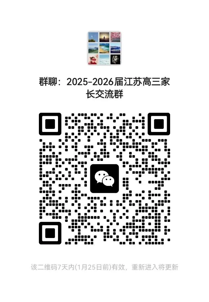 更多高考资讯可进“2025—2026届江苏高三家长群”了解,群内会第一时间发布江苏省最新高考信息,并有专业老师讲解,及时答疑解惑,有问必答,帮您理清各项政策细节,把握一切机会。非诚勿扰。