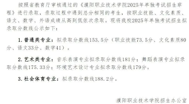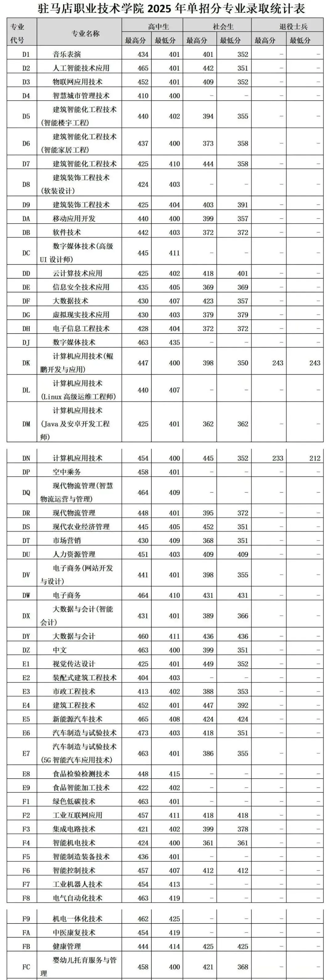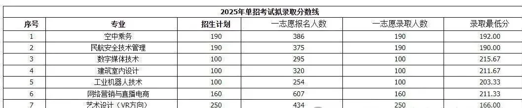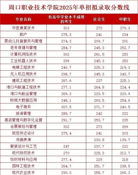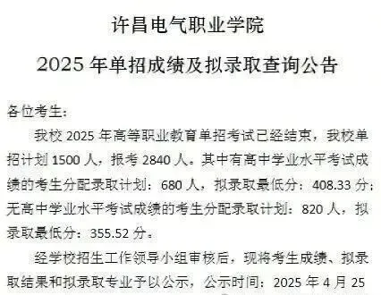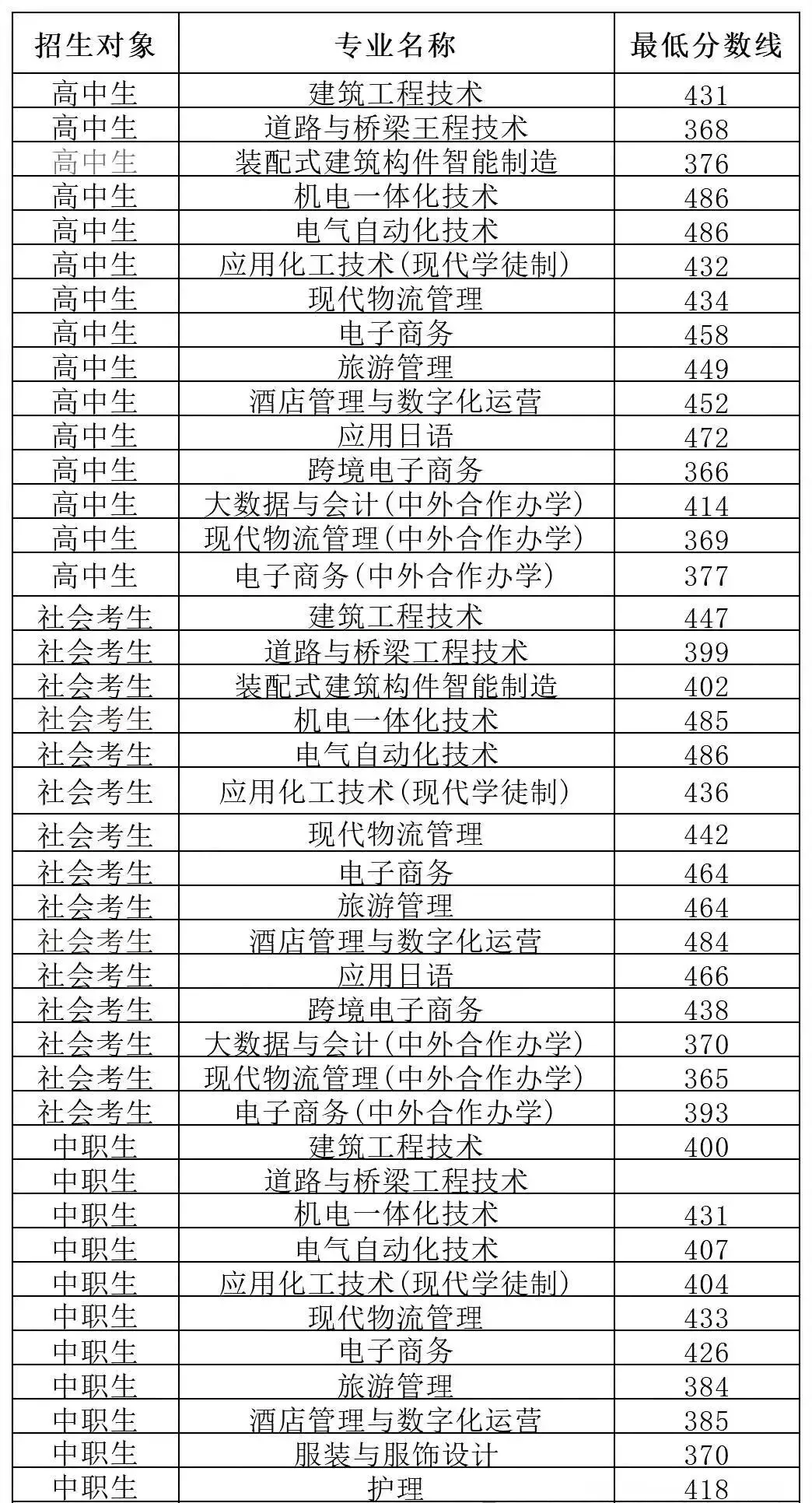 我校2025年单招考试分三类考生分别划定录取分数线:1.高中生分数线:470分;2.高中(社会)生分数线:441分;3.中职生分数线为:416分。