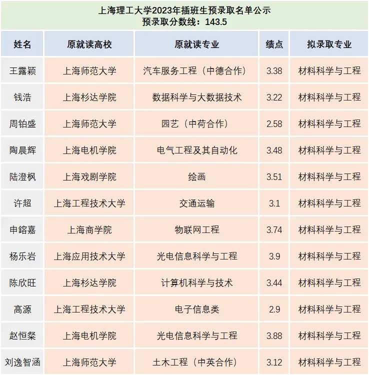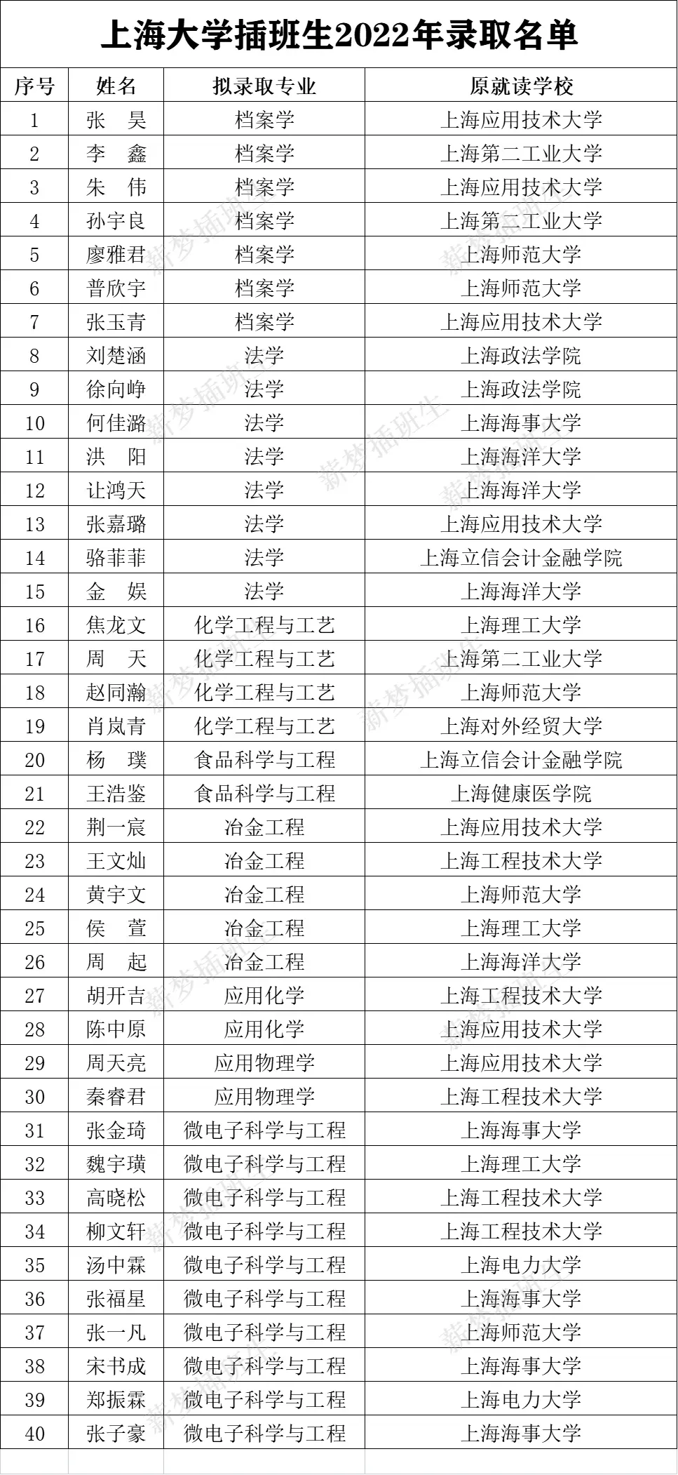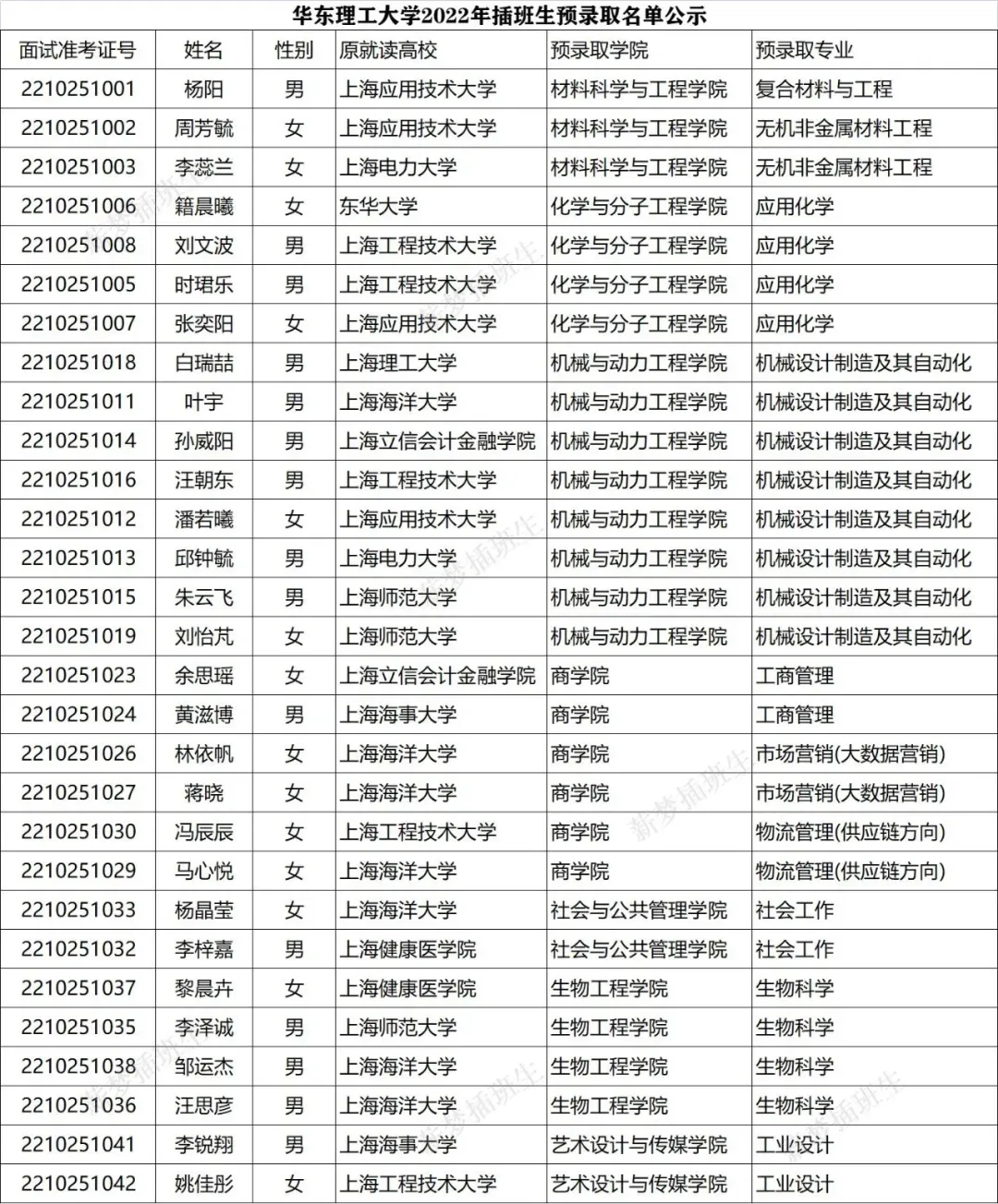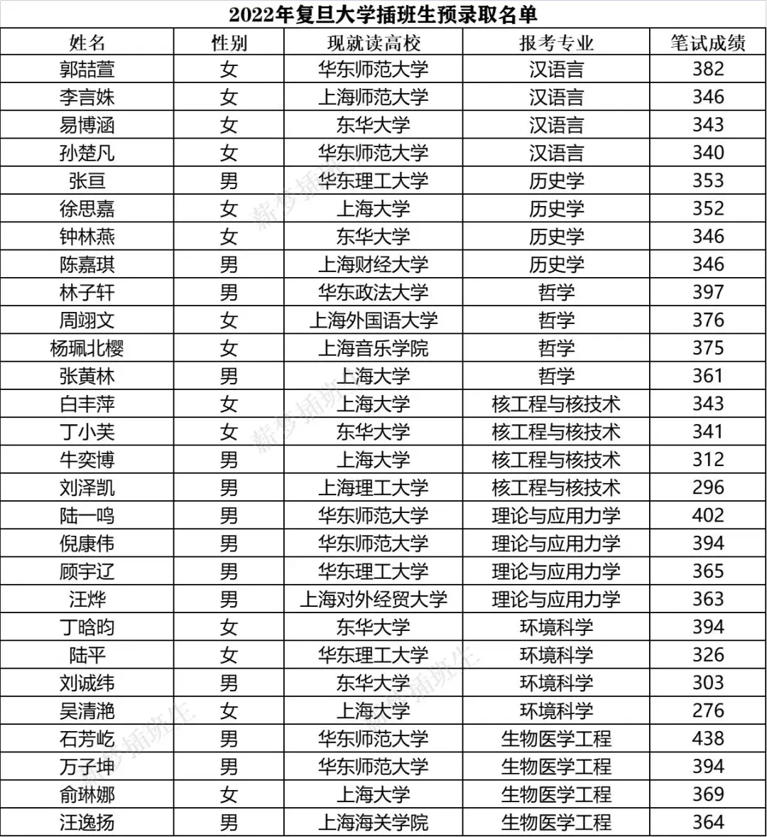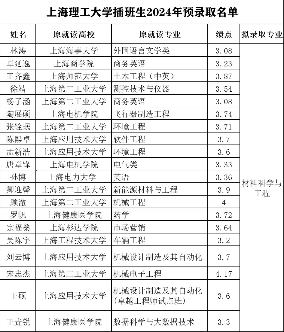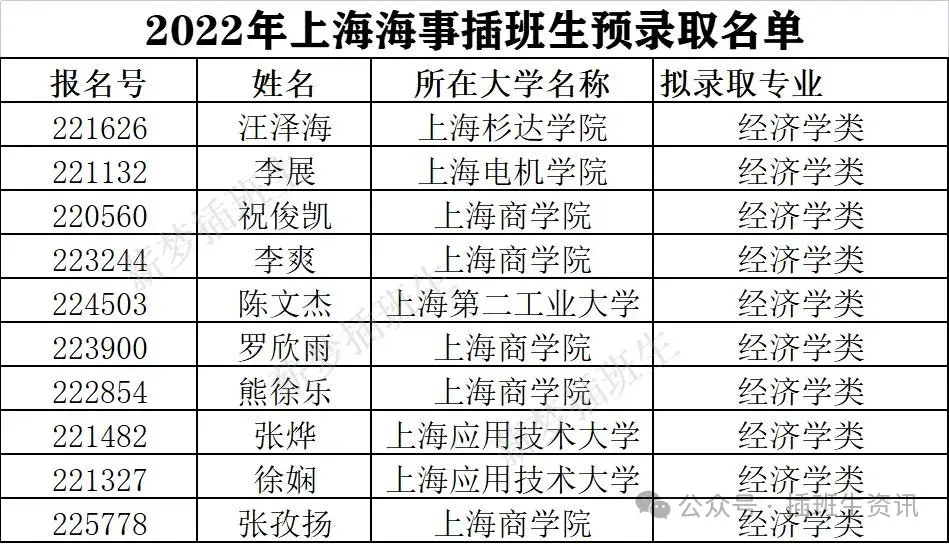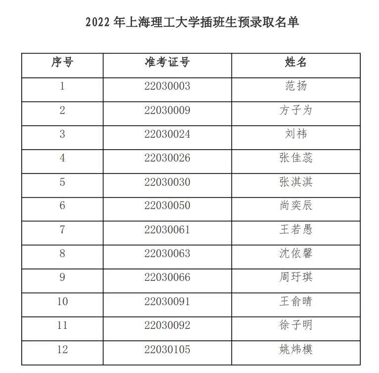 2022年上海交通大学插班生预录取名单