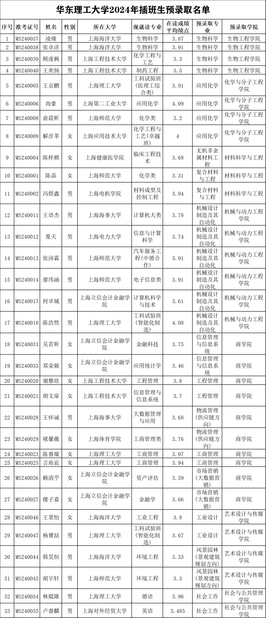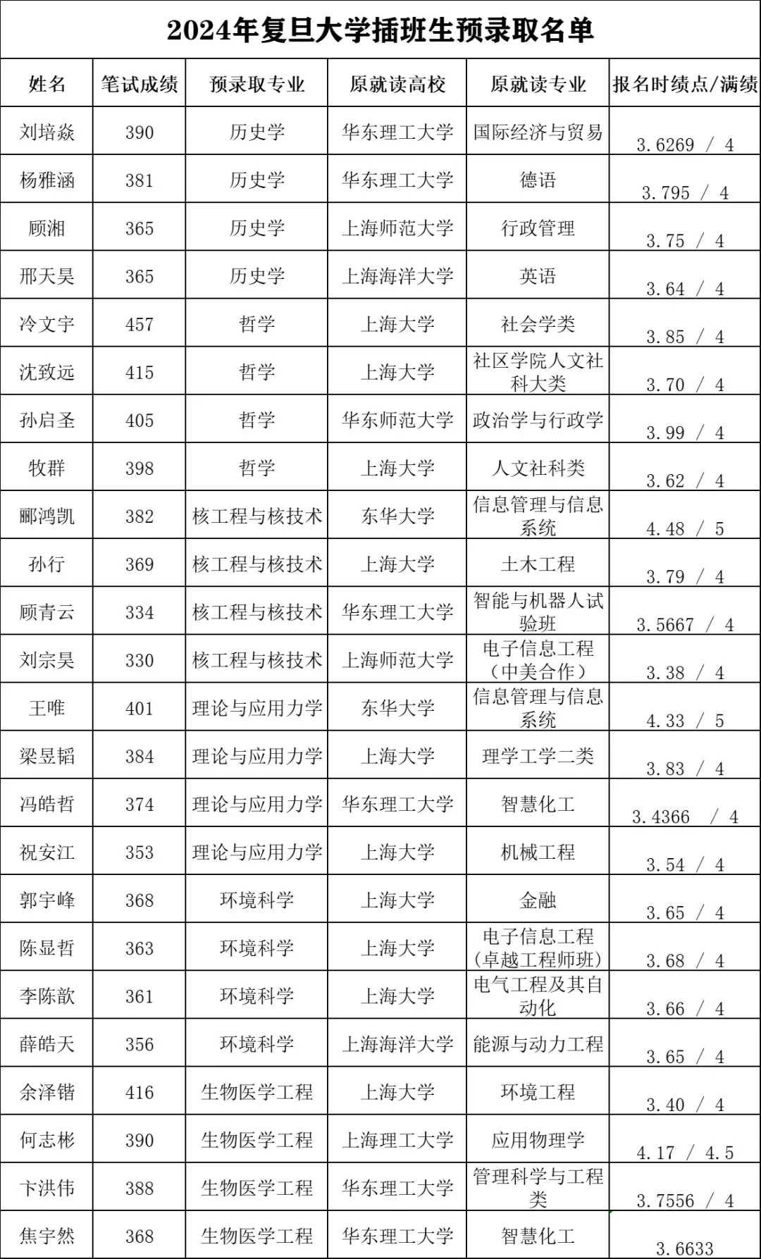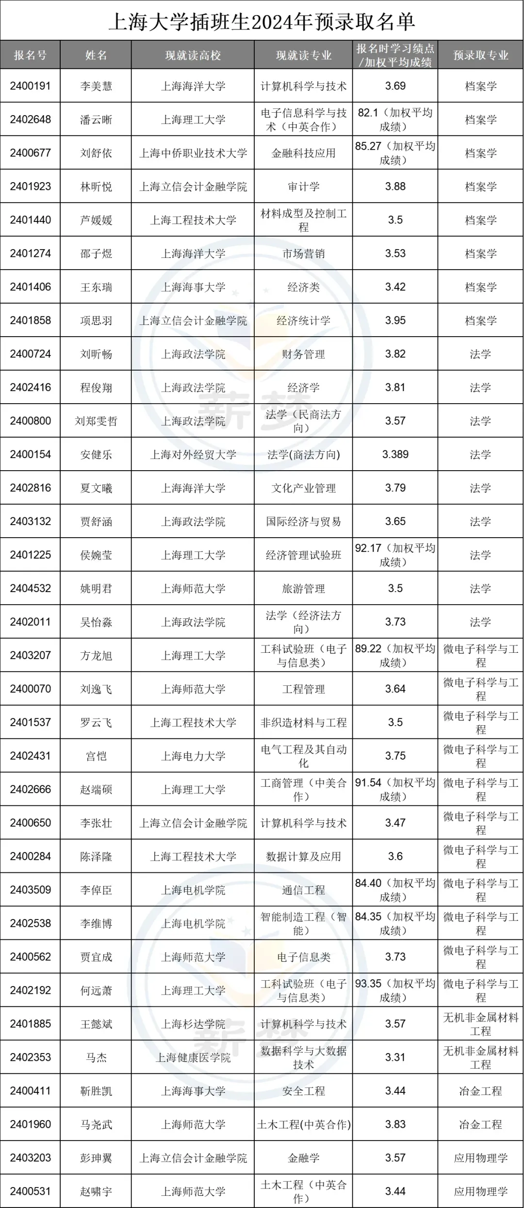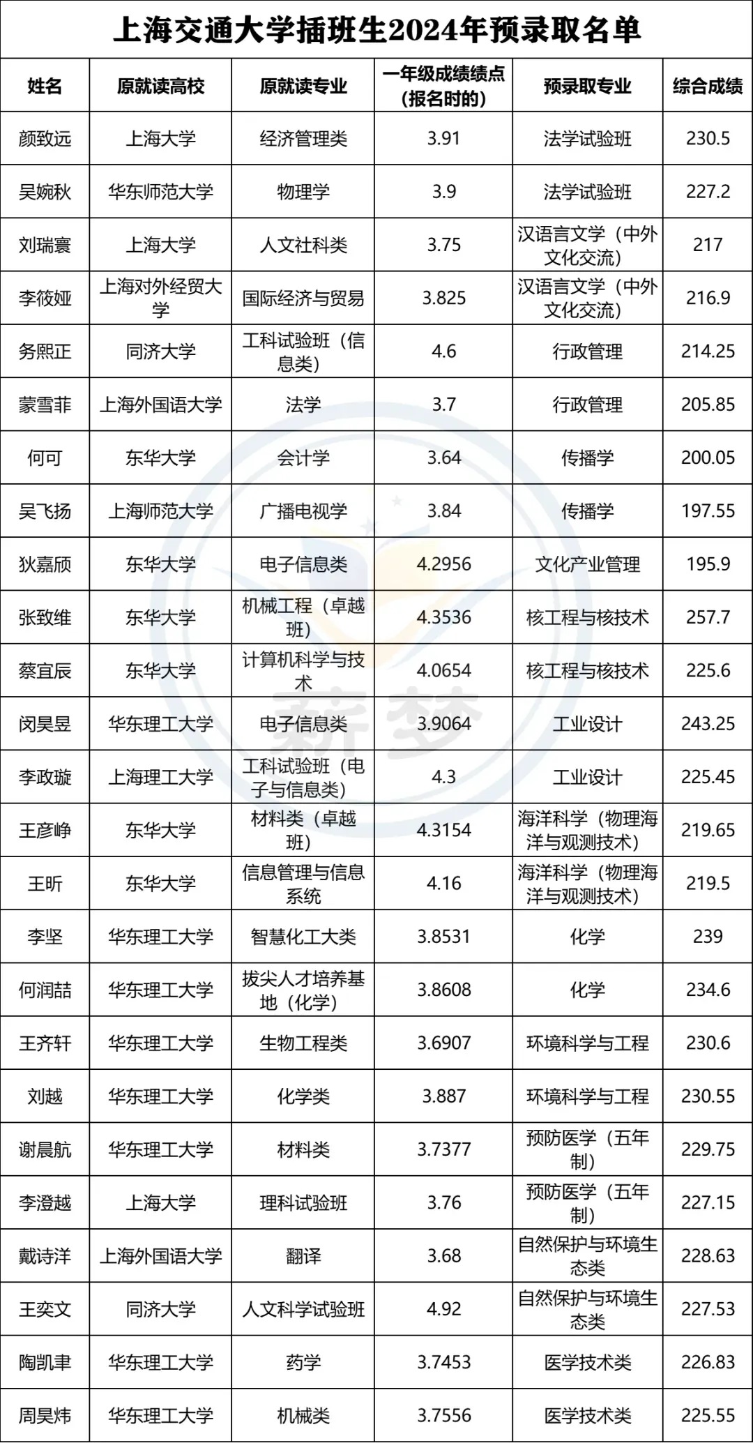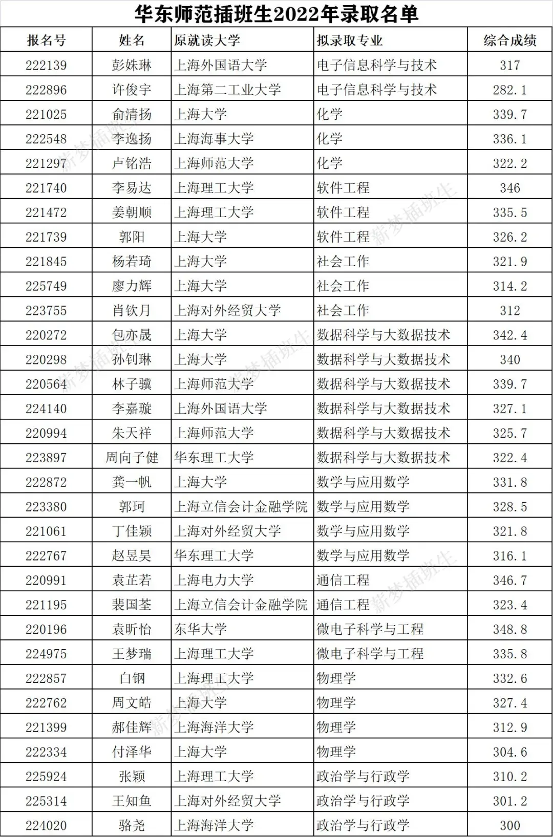 2022年上海交通大学插班生预录取名单