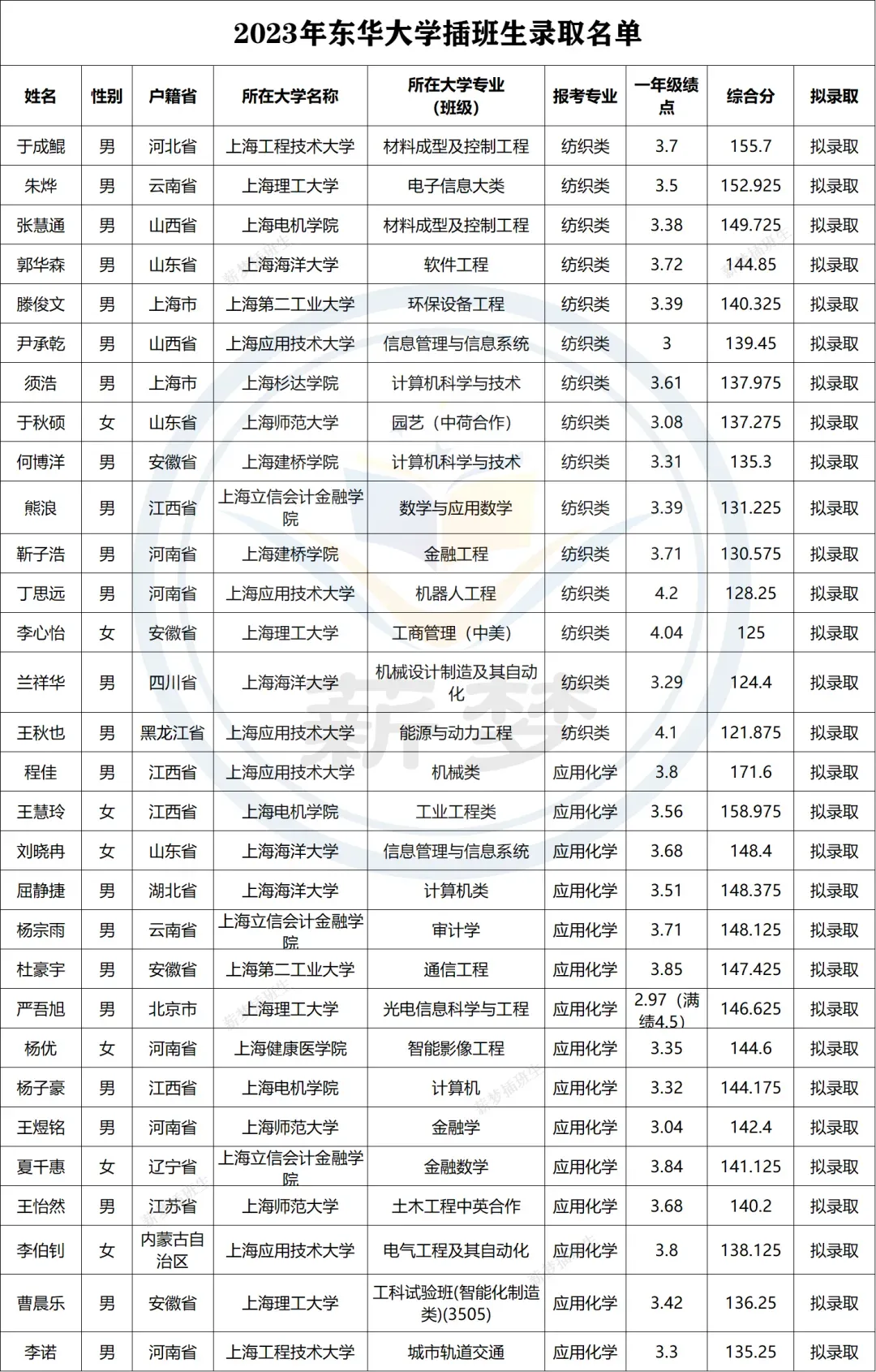 华东理工大学插班生录取生源