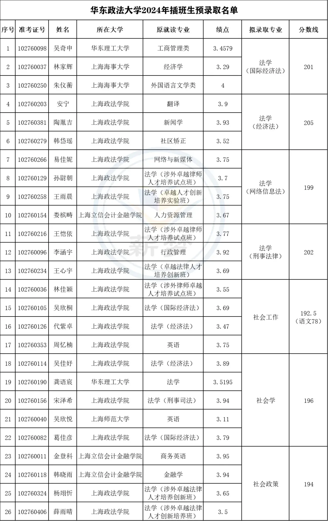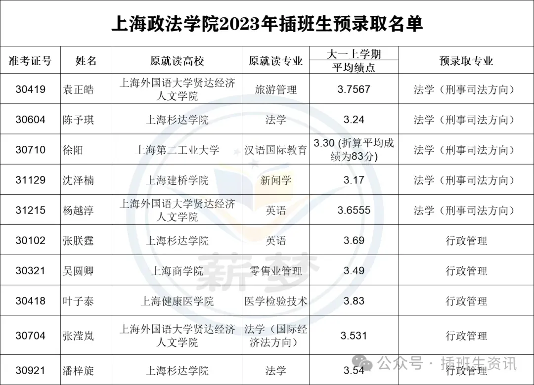 上海政法插班生录取生源统计分析