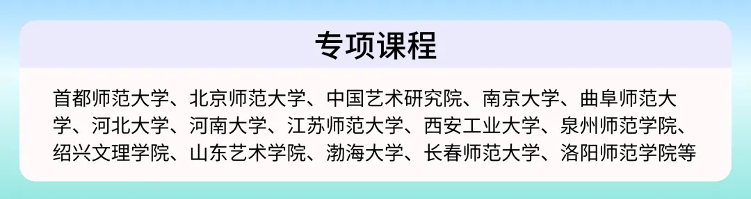 问学考研专项课程主要针对首都师范大学、北京师范大学、南京大学、曲阜师范大学、河北大学、河南大学、绍兴文理学院、西安工业大学、江苏师范大学、泉州师范学院、山东艺术学院、渤海大学等高校进行针对性授课、答疑。