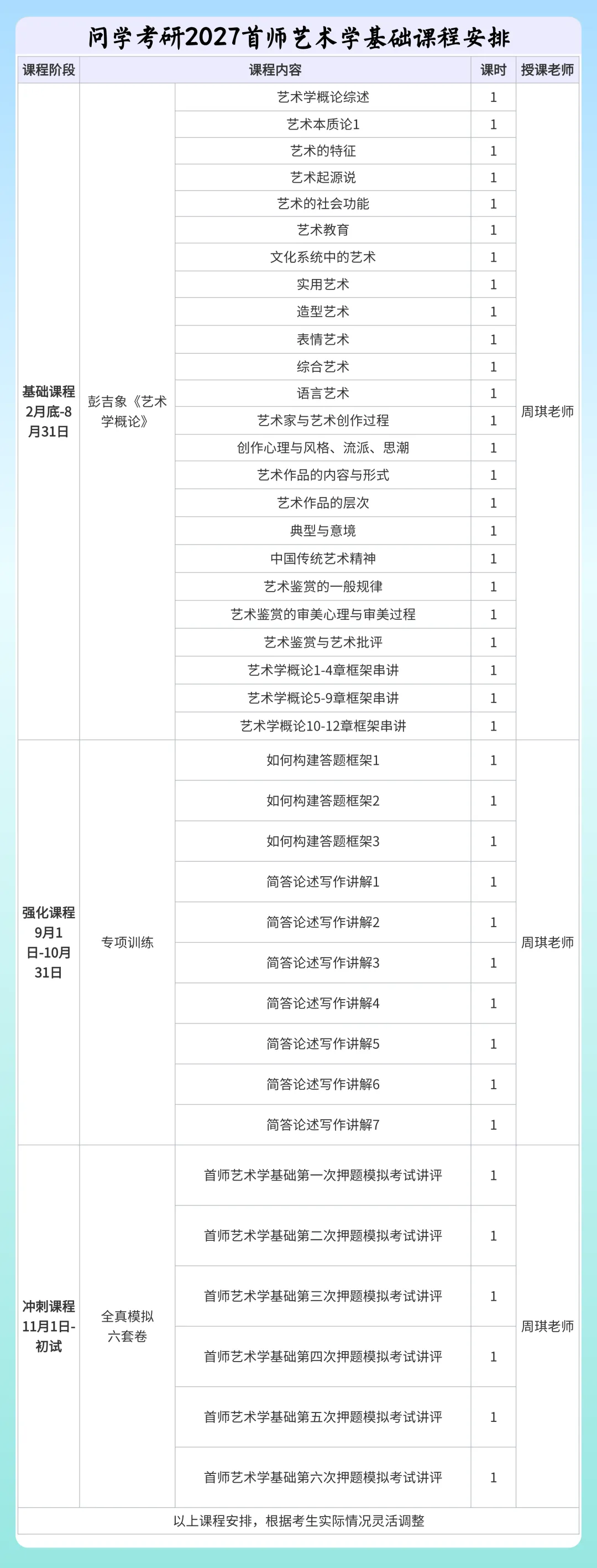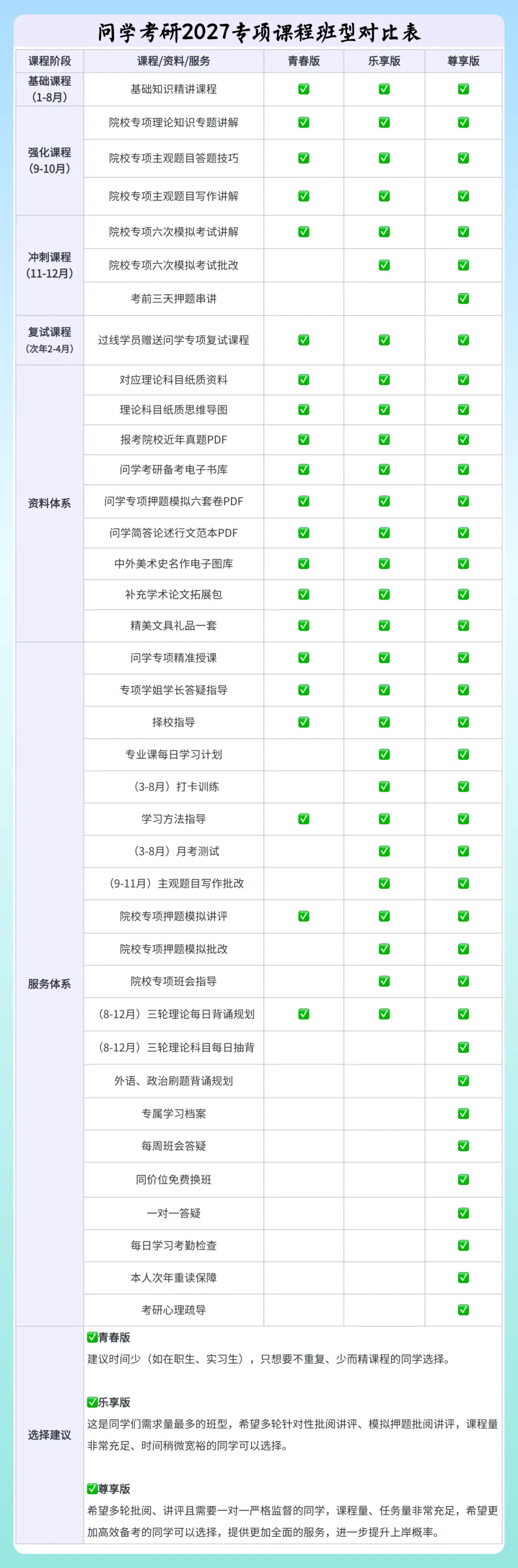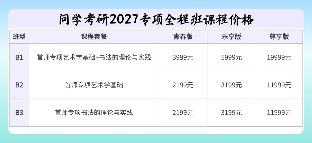 2027考研备考要开始啦,很多同学不知道如何下手,艺术学基础、书法的理论与实践如何针对考研进行提升,为了帮助同学们解决以上问题,高效备考,节省考研上岸时间,问学考研特推出2027首都师范大学考研全程班,多种方案帮助大家高效备考,助力学子考前冲刺顺利考入理想的研究生院。