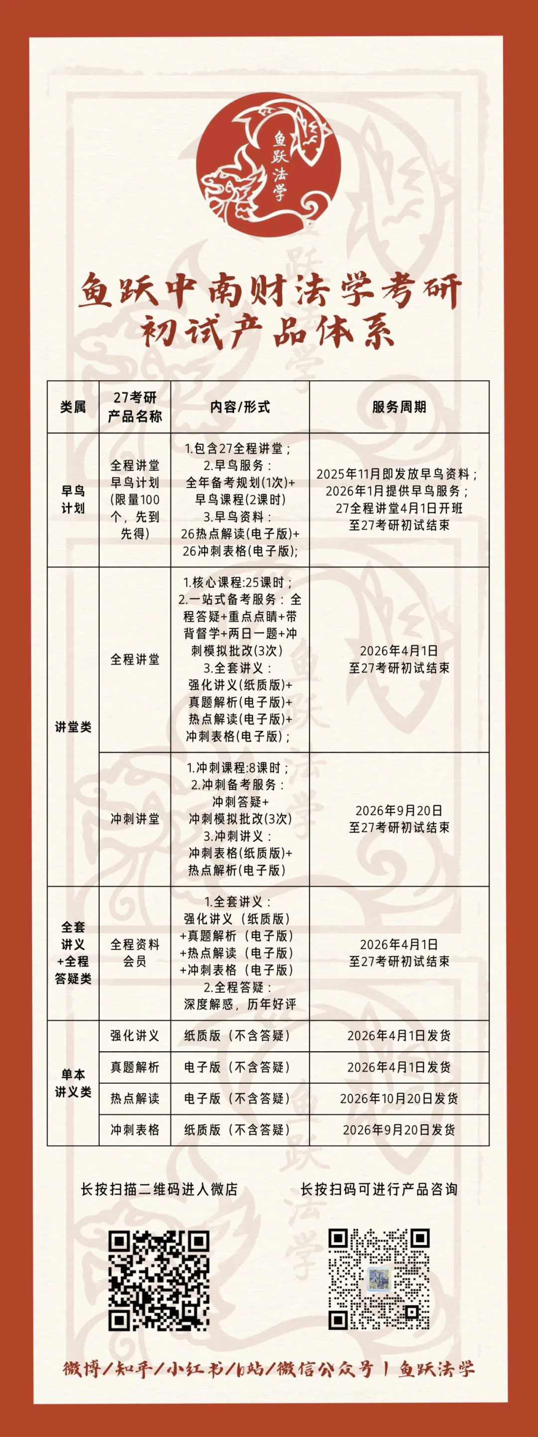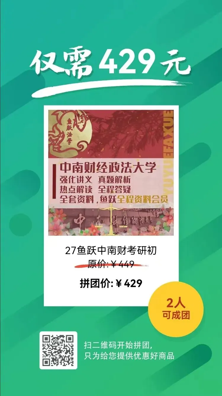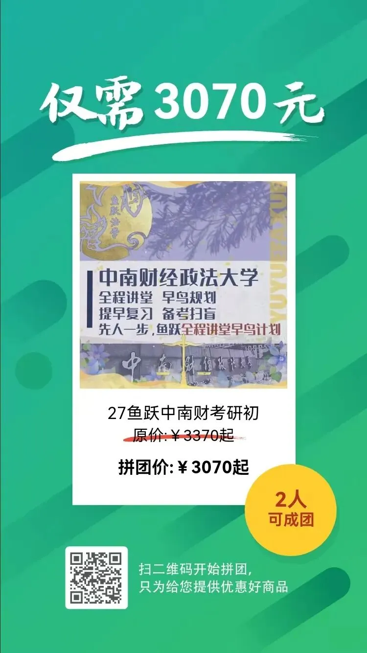 凡此,27中南财考研初试系列将包括全程讲堂早鸟计划、全程讲堂、冲刺讲堂、全程资料会员四个班次,以及强化讲义、真题解析、热点解读、冲刺表格四类资料,多层次、全方位助力大家上岸。其中,全程讲堂早鸟计划=27全程讲堂+早鸟课程(2课时)+全年备考规划(1次)+26热点解读(电子版)+ 26冲刺表格(电子版),先到先得,共计发布100个,两科联报还可获额外优惠共400元。点击文末“阅读全文”或扫描文中拼团海报即可购买,更多图文介绍详见下文或扫码添加萤火鱼师姐咨询。