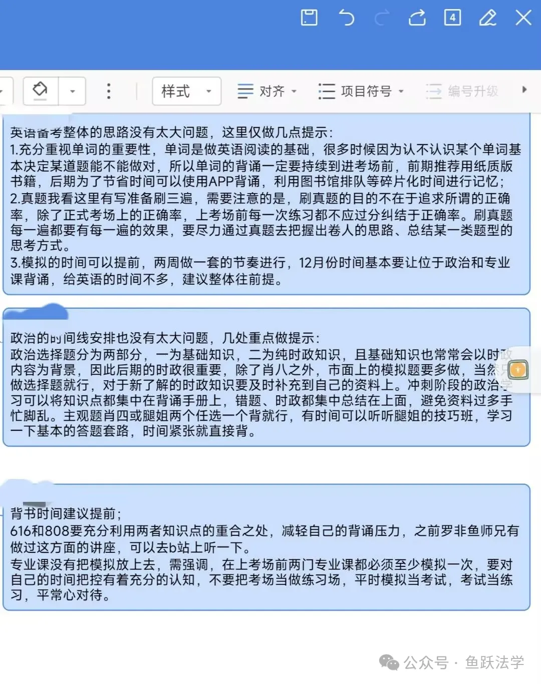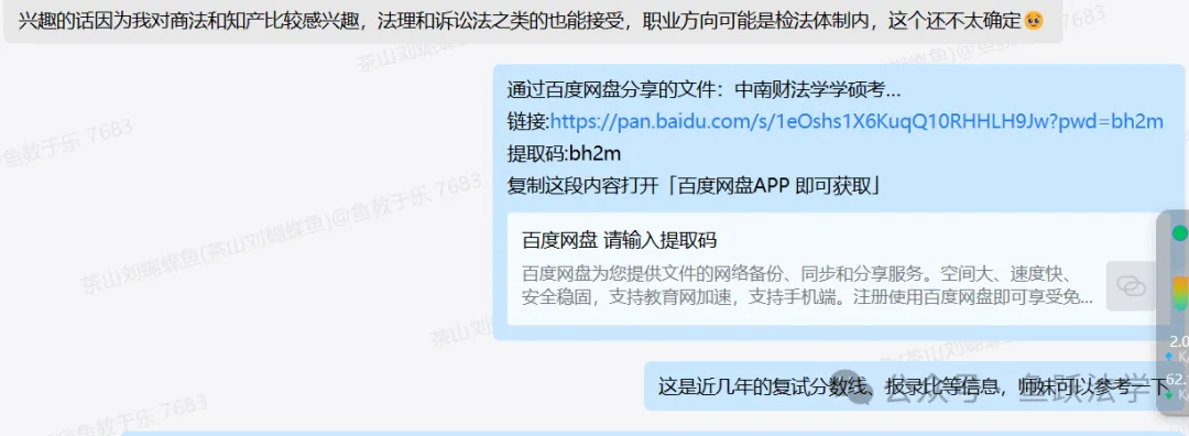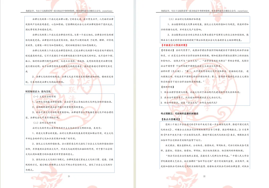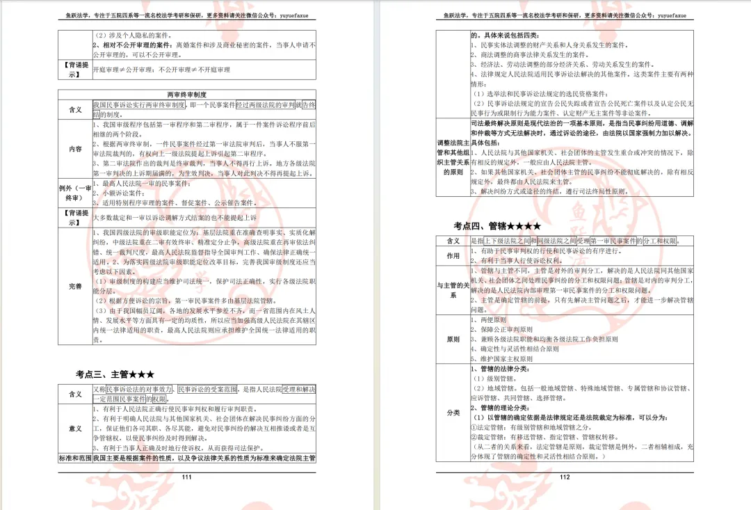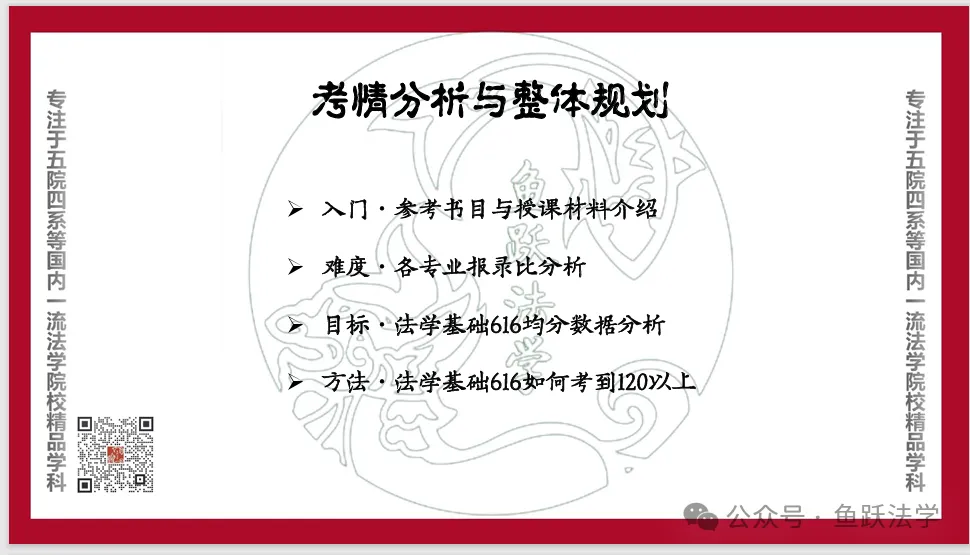 对于学科考点重点不明或部分知识点的内容可能单靠自身难以理解,需要借助师兄师姐的讲解,因此我们为大家准备了本专业的考情分析、要点重点梳理等的讲解课程(约2课时),帮助大家在备考前期对于重要知识点能够做到理解到位,在后期少走弯路,背诵时更快上手、先人一步。此外,鱼跃中南财团队也会不定期开展讲座(此前已举办过的相关讲座可于“鱼跃法学”视频号上观看回放),帮助大家更好地做好备考规划、合理安排时间。
