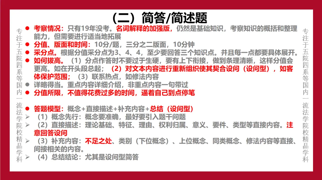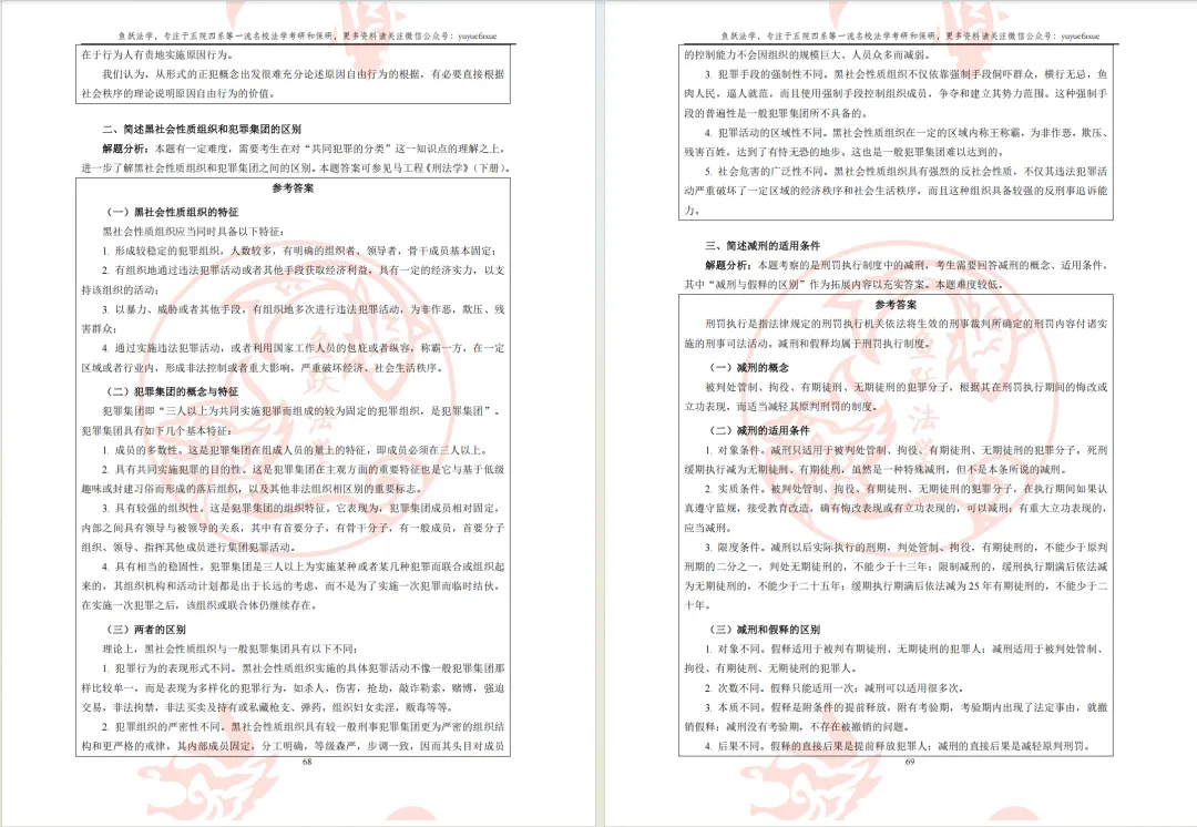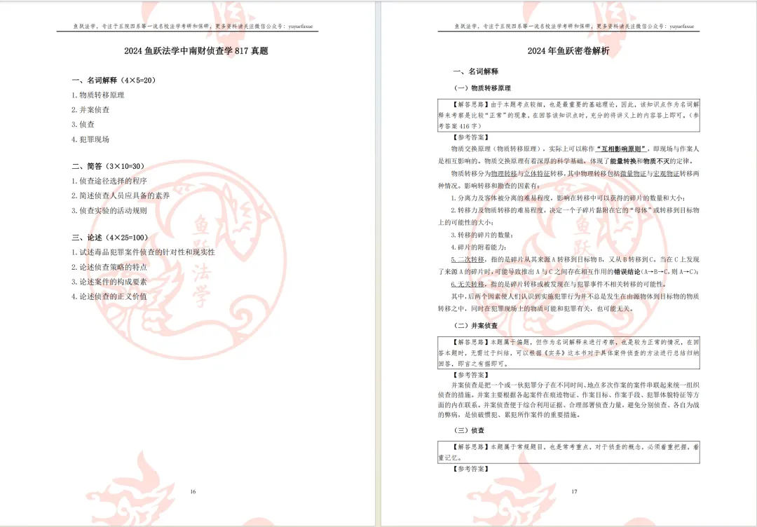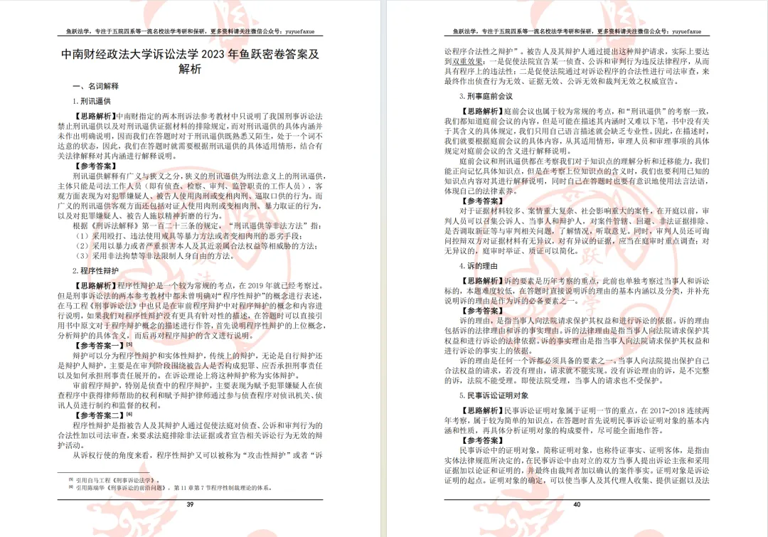 我们基本可以形成一个共识,即真题在中南财法学各科考研中都占据非常非常非常重要的地位。真题解析的适用人群为十三科全体考生,旨在帮助考生实现“知己知彼、百战不殆”。鱼跃中南财各学科真题解析涵盖了至少十年的初试题目与答案即系。不仅能够提供具有背诵和积累意义的优质参考答案,更重要的一点在于向考生展示答题角度与解题思路。真题解析同样伴随备考全程。一方面,在考研前期充分利用真题解析可以帮助考生把握命题规律,明确考试重点;另一方面,在考研后期充分利用真题解析可以帮助考生积累答题素材,拓展答题视野。