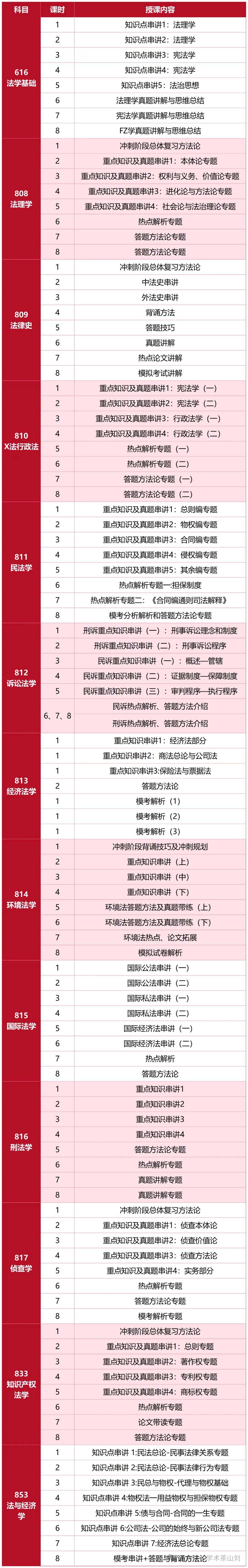 616法学基础、808法理学、809法律史、810宪法与行政法学、811民商法学、812诉讼法学、813经济法学、814环境法学、815国际法、817侦查学、816刑法学、833知识产权法学(知产专硕)、853法与经济学