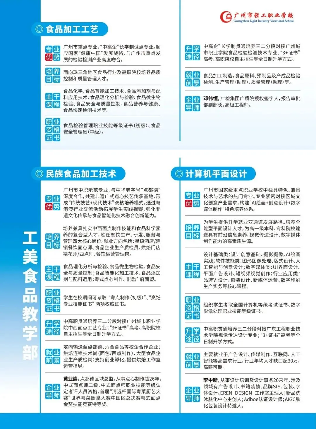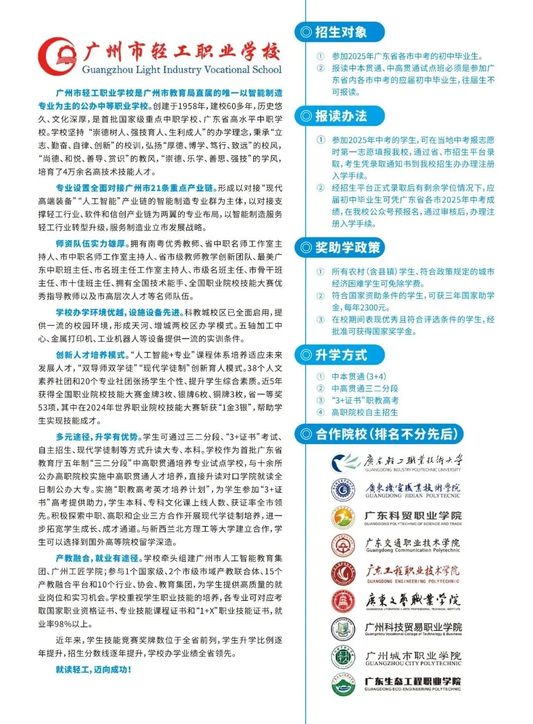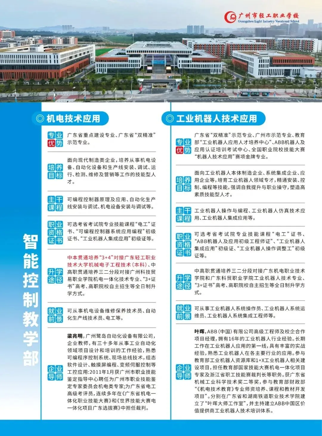 广州市轻工职业学校是广州市教育局直属的唯一以智能制造专业为主的公办中等职业学校。创建于1958年,建校60多年,历史悠久、文化深厚,是首批国家级重点中职学校、广东省高水平中职学校。学校坚持 “崇德树人、强技育人、生利成人”的办学理念,秉承“立志、勤奋、自律、创新”的校训,弘扬“厚德、博学、笃行、致远”的校风,“尚德、和悦、善导、赏识”的教风,“崇德、乐学、善思、强技”的学风,培育了4万余名高技术技能人才。